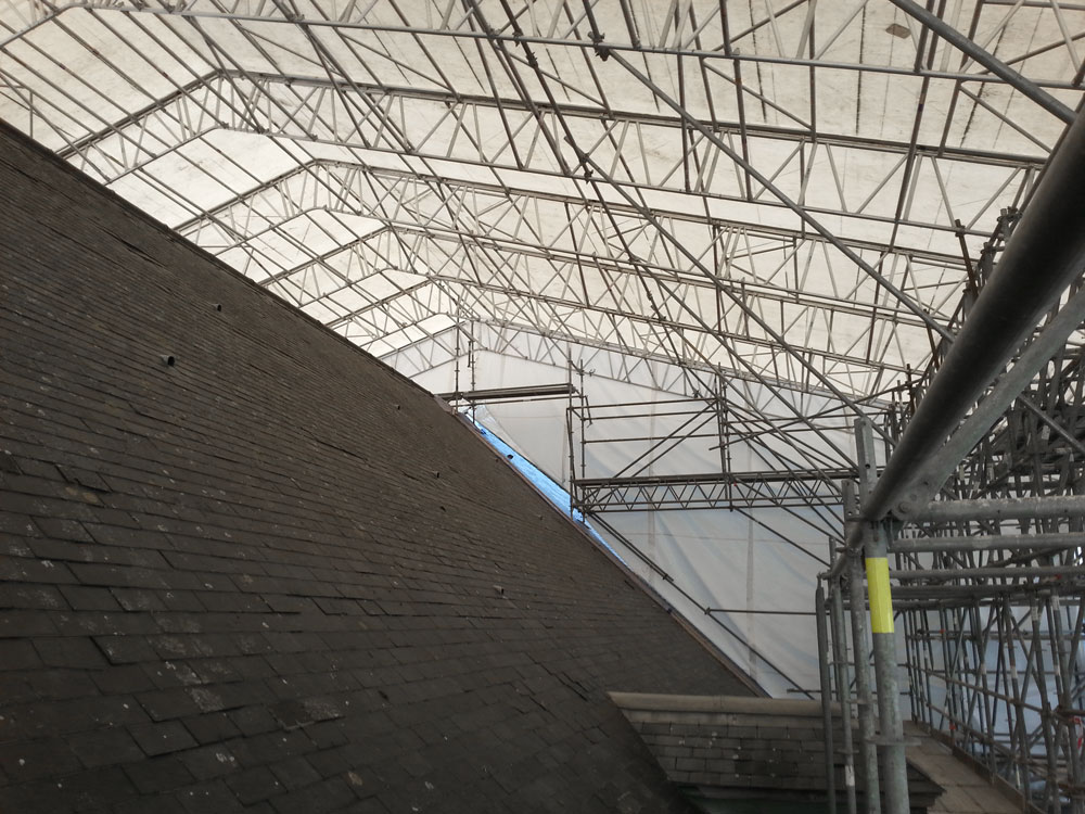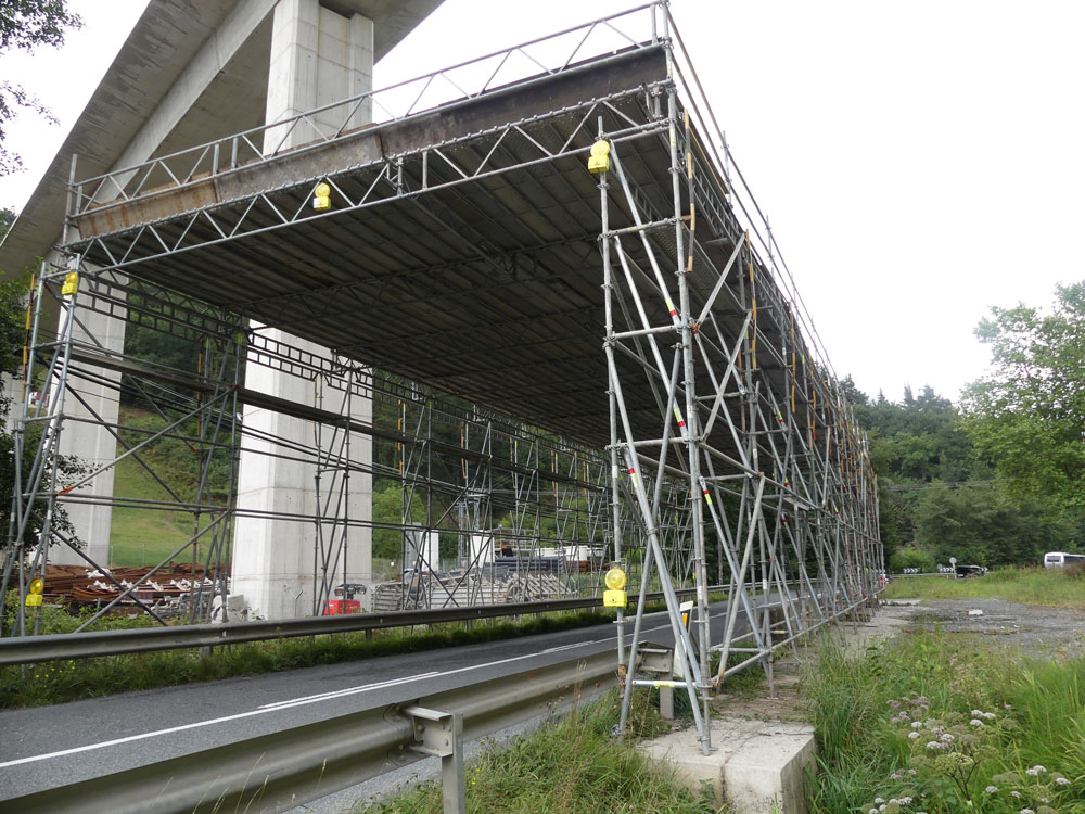Se colocan en la construcción de pasos a distinto nivel, protegiendo a los operarios en la realización de sus labores constructivas y permiten que por debajo del andamio de protección el tráfico fluya con total seguridad. La estructura de protección se compone de torres de andamio, celosías y la plataforma de cubrición.