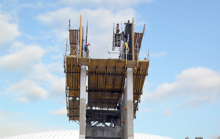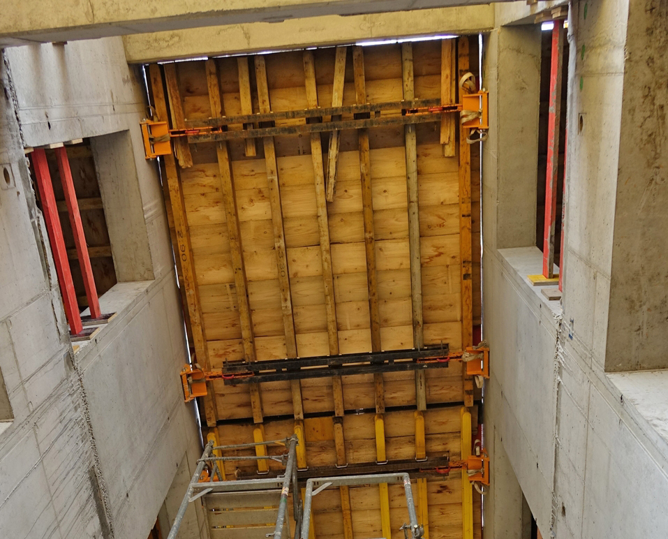 La plataforma para soporte de moldaje en huecos KSP es válida para huecos de ascensor y escalera, pilas huecas u otro tipo de cavidades donde sea preciso apoyar el moldaje. Habitualmente se combina con consolas de trepado convencionales en caras exteriores del muro.