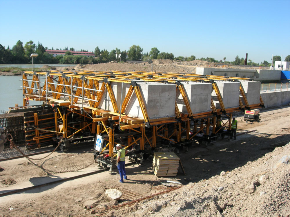 Carro móvil para moldaje de muro, diseñado para labores de moldaje/desmoldaje de muros de hormigón de gran longitud a una o dos caras. Se trata de una solución idónea para ejecutar muros repetitivos en construcciones como estaciones de metro, esclusas, galerías, canalizaciones etc.