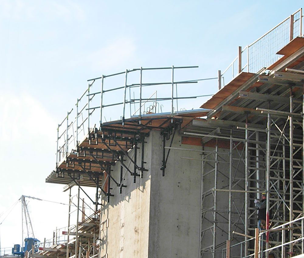 Sistema de seguridad enfocado a la construcción de muros de cierta altura, donde la ejecución de muro se realiza por fases. Estas plataformas de trabajo funcionan como apoyo para el moldaje y para realizar tareas posteriores como cerramientos o reparaciones en los muros ejecutados.
