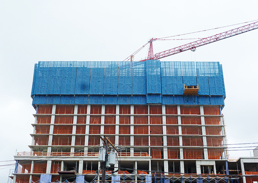 Para garantizar un espacio de trabajo seguro, se ha cubierto el perímetro del edificio con la protección autotrepante HWS. Son paneles que envuelven la planta en ejecución y tres plantas inferiores y que se elevan de manera hidráulica, a medida que se crece en altura.