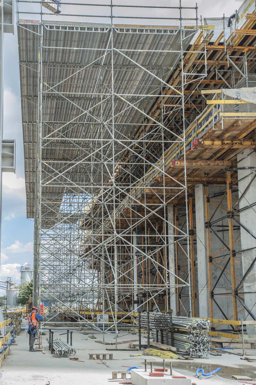 ULMA ha aportado soluciones integrales en materia de seguridad. El moldaje de muro se ha suministrado con plataformas de seguridad a ambos lados con dos soluciones: estándar, basada en plataformas metálicas pre montadas sobre consolas, o con la nueva plataforma de seguridad para muro SBU. Este sistema permite configurar plataformas de trabajo con elementos del andamio certificado BRIO. Al contar con elementos modulares puede adaptarse a distintas geometrías garantizando siempre que el trabajo y acceso de los operarios en el montaje de moldajes sea una tarea totalmente segura.