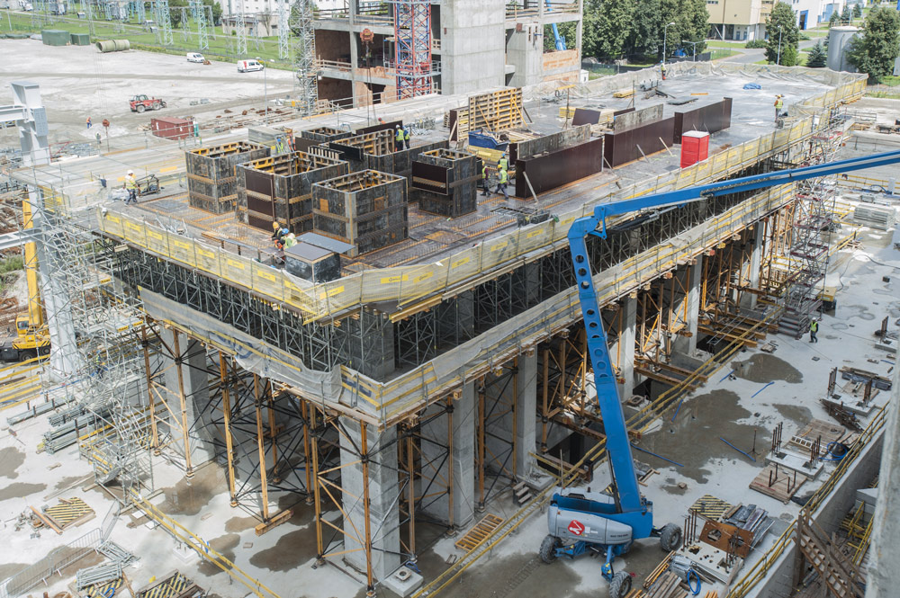 El moldaje de las losas y de vigas del edificio se ha realizado con Mesas MK y ENKOFLEX. Las Mesas MK al disponer de riostras MK permiten el plegado y el bloqueo de puntales, en este caso ALUPROP. Así, modificada su geometría, las mesas se prestaban a un transporte más sencillo y rápido entre los niveles. Para losas de alturas de hasta 9,5 m, se han empleado cimbras T-60.