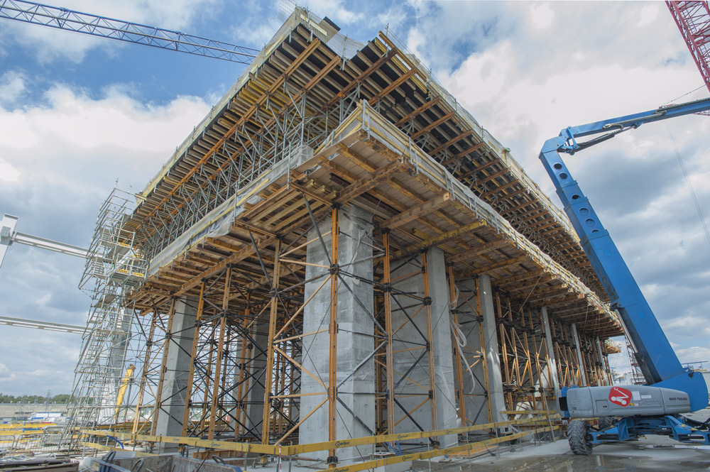 Para garantizar un acceso seguro al moldaje de pilares se ha suministrado la plataforma universal, de 52 cm de ancho. El primer tramo es móvil, por lo que puede ajustarse perfectamente a la altura de cada estructura ejecutada.