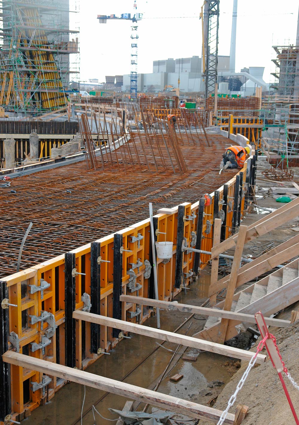 Durante la primera fase se emplearon aproximadamente 30.000 m3 de hormigón, con diversos sistemas de moldaje en la ejecución de muros, pilares y losas para la sala de máquinas, la zona de calderas, la torre de enfriamiento y edificios auxiliares.