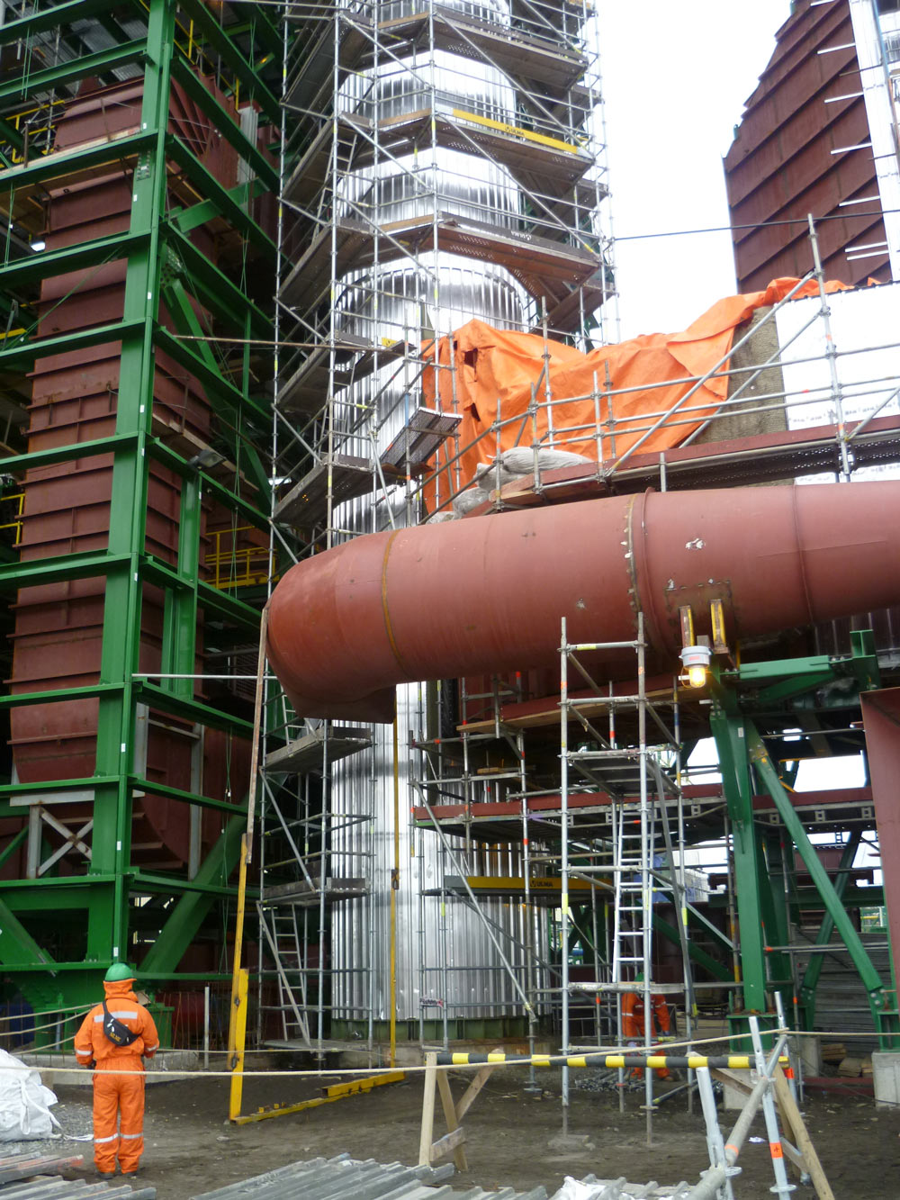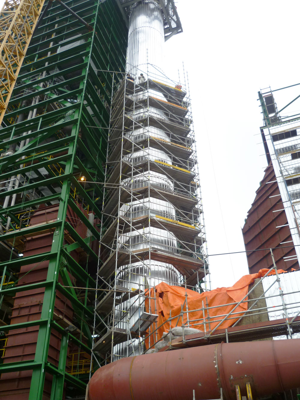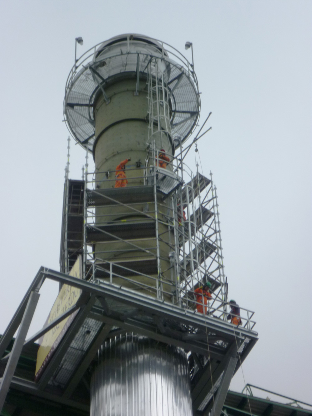 Se solicita armar andamios para realizar mantención y revestimiento de la chimenea para lo cual se diseñan los andamios BRIO acomodándose a las estructuras existentes, evitando escaleras y otras plataformas de la celulosa.
