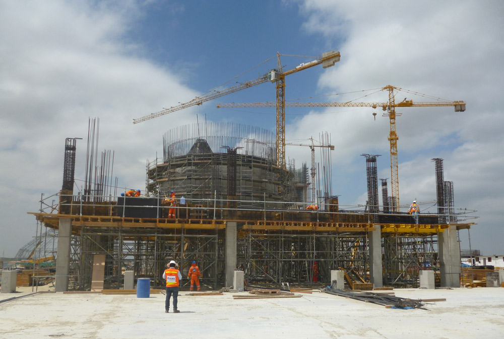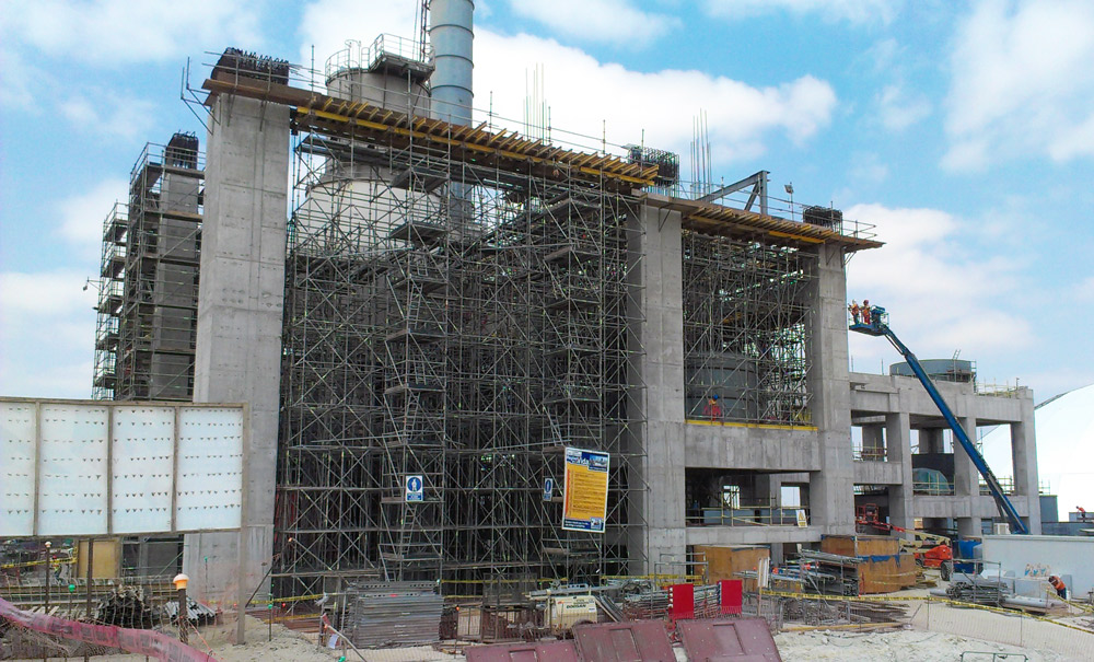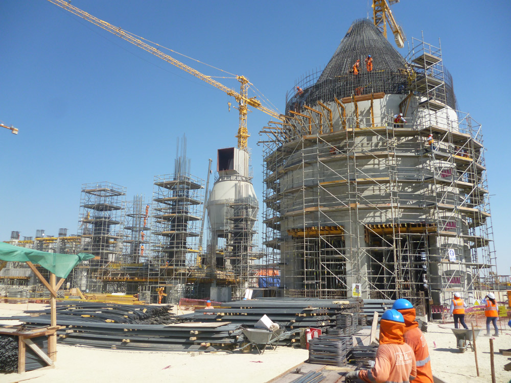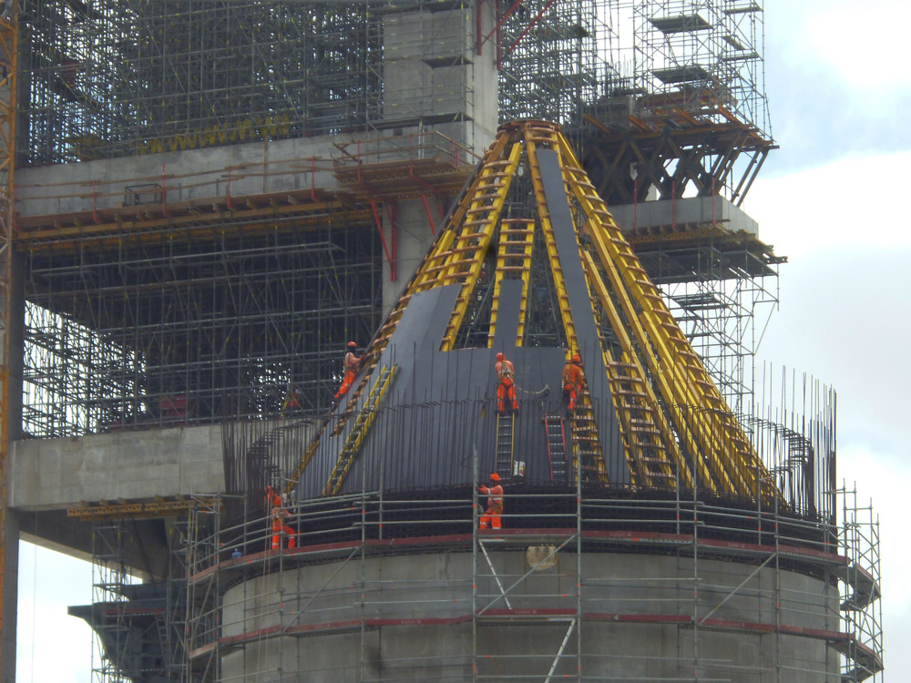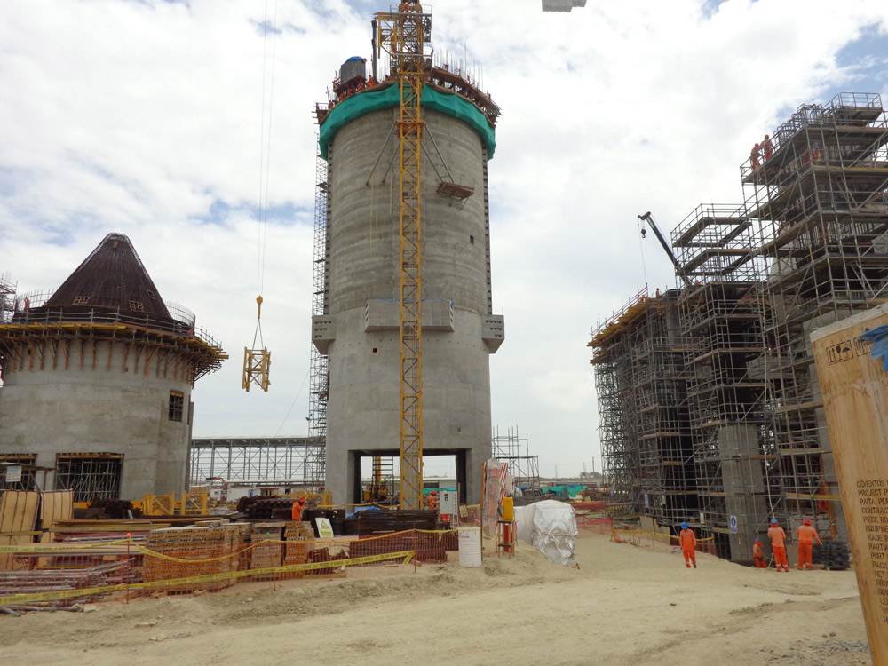 La edificación más compleja en este proyecto, el silo de cemento, se ha construido con 70 m de altura, muros cilíndricos y losas cónicas. A los 18 m de altura, el anillo exterior ha requerido del apoyo de las consolas BMK, configurables a muros circulares y de fácil montaje. Su función ha sido la de soportar los paneles COMAIN, el encofrado del anillo, y la de crear un nivel donde colocar plataformas de trabajo para las labores de ferrallado y encofrado.