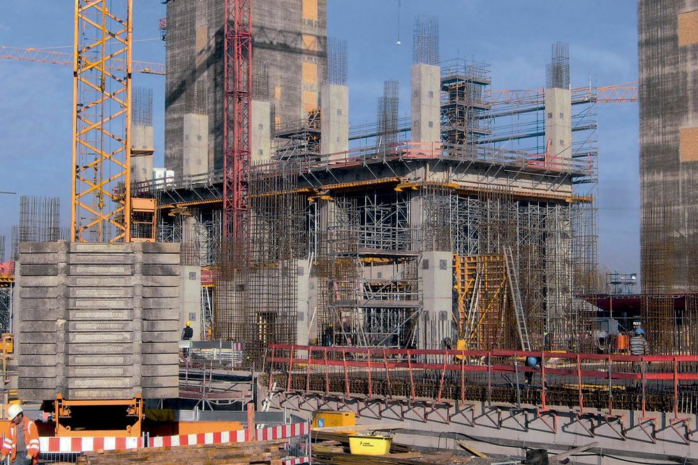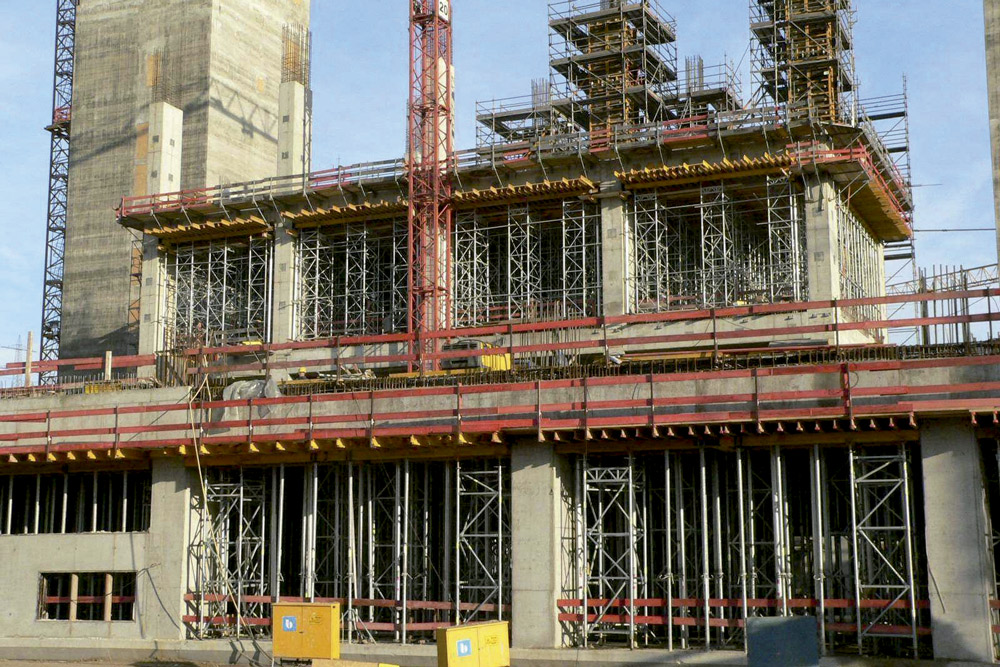 Este edificio de varias plantas, de 100 m longitud, 50 m de ancho y una altura de 43 m, requirió un sistema de zapatas sólidas de 2 m de espesor. Debido a los requisitos estáticos, los pilares, losas y vigas debían tener grandes dimensiones. De ahí que de acuerdo a los tiempos de trabajo reducidos y los consiguientes ciclos de ejecución, se emplease una amplia gama de productos del portafolio en la obra. El proceso de ejecución de muros, pilares y demás estructuras fue rápido gracias al empleo de 3.000 m2 de Moldaje Modular ORMA. La amplia gama de paneles posibilitó al cliente seleccionar el adecuado en este caso ya que sus longitudes y anchuras permiten su adaptación a las necesidades de cualquier obra. Además, todos los pilares estuvieron equipados con sus respectivas plataformas de trabajo, garantizando así la seguridad de los operarios en el proceso de hormigonado y en los trabajos en altura.