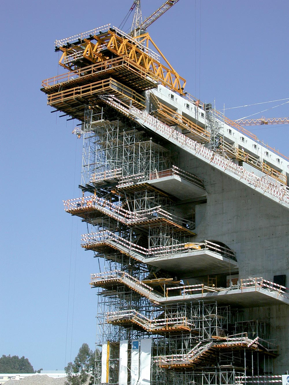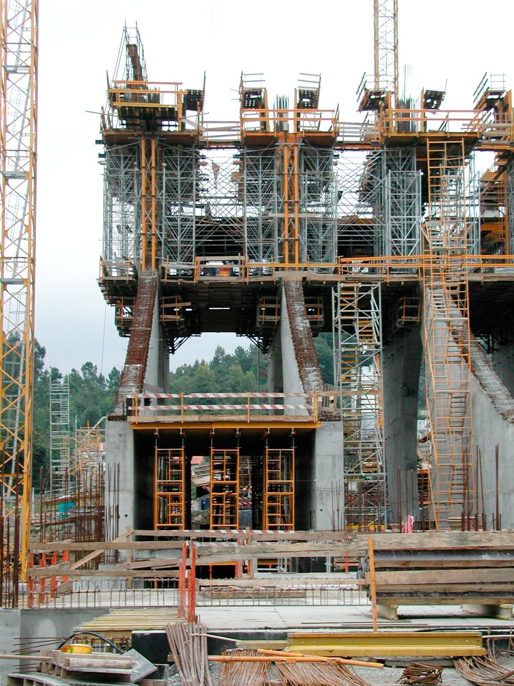 Las losas laterales con voladizos de 6 m longitud y espesor variable de 30 a 60 cm se resolvieron: en el lado norte, con cimbra a 20 m en la zona inferior, incrementándose en altura a medida que se apeaban las losas y escaleras, y en la sur, con un pórtico de T-500, de 20 m de altura, sobre el que se estableció una cimbra cuajada hasta 24 m.