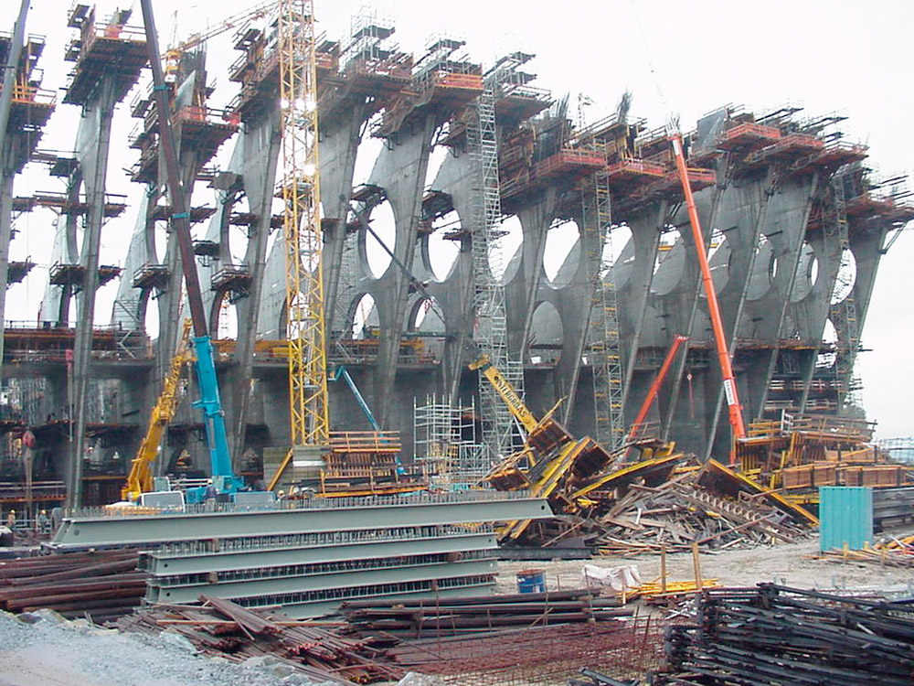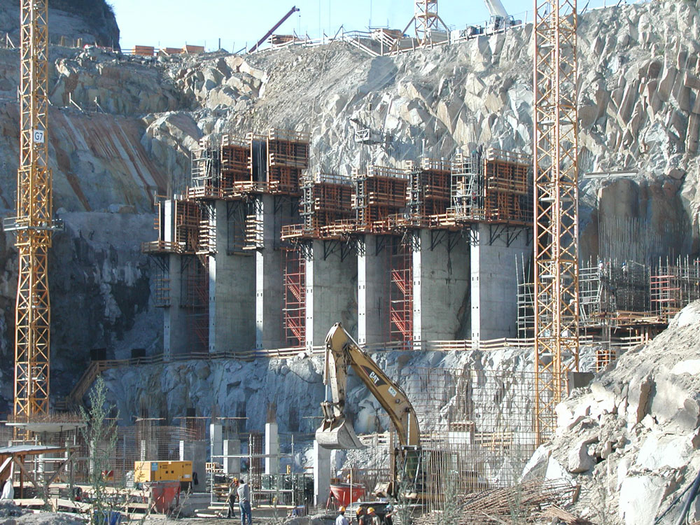 A 30 m de altura, los muros en su parte frontal presentan un voladizo de 13 m resuelto con el mencionado sistema, así como los tapes dorsales con Consola G, debido al ataluzado del muro. El Moldaje ENKOFORM V-100 demostró su versatilidad y eficacia en la solución de las múltiples geometrías de esta obra.