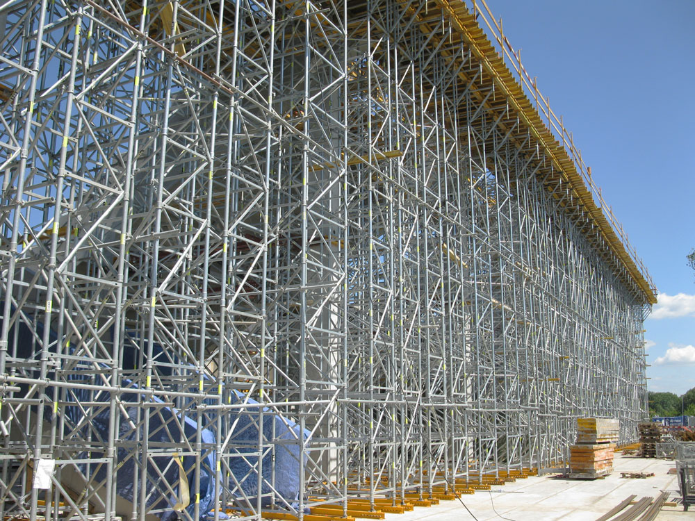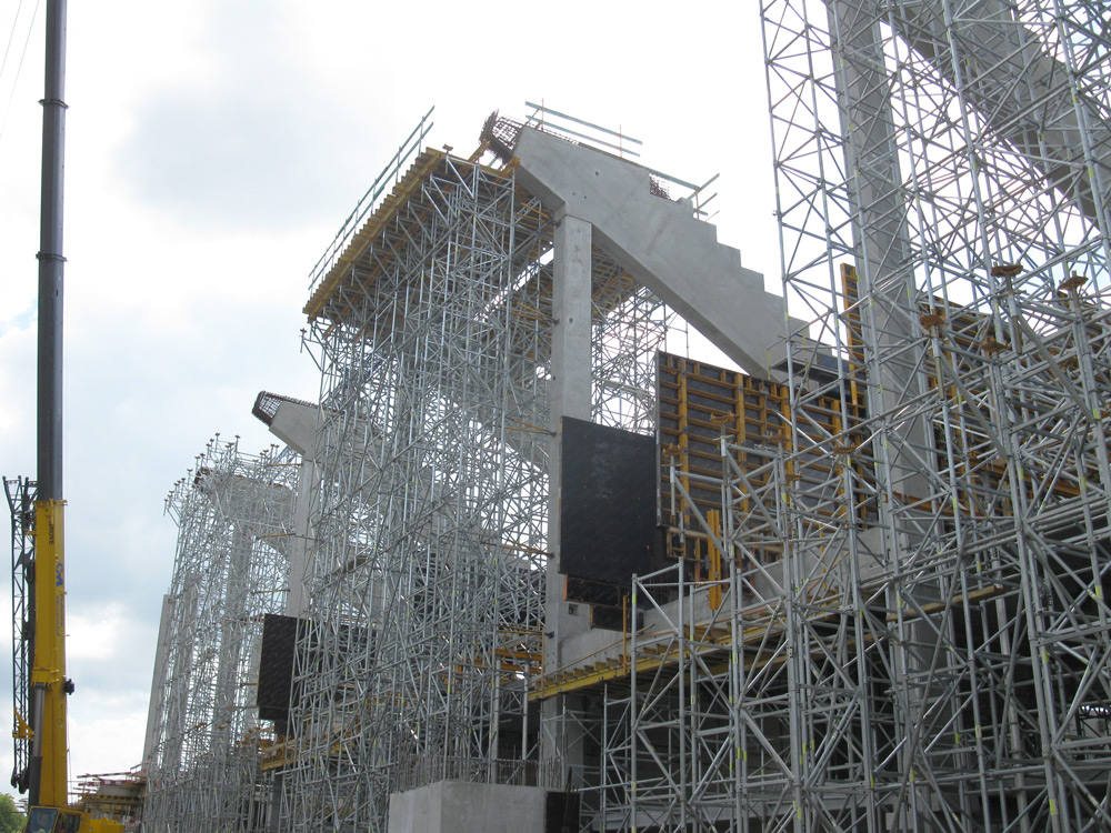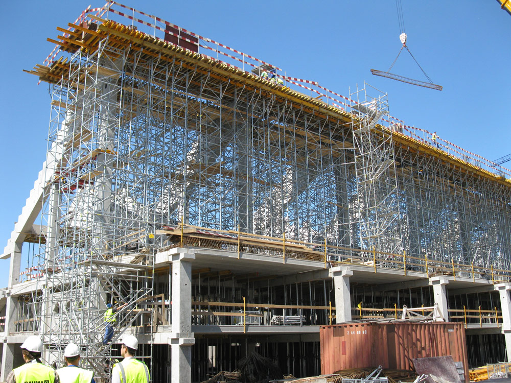 Las obras se iniciaron de forma simultánea en tres de las cuatro gradas (norte, sur y este). Las zapatas, los cantos de losa, muros y huecos de ascensor se ejecutaron con el eficaz sistema de Moldaje Vertical NEVI. Debido a los altos requerimientos arquitectónicos exigidos, se ejecutaron pilares de 60 x 80 cm con el sistema modular ORMA que permitió alcanzar una dimensión de pilar de 115 x 115 cm con los mismos paneles. Ambos sistemas modulares demostraron su rentabilidad ya que sus paneles pueden unirse con un mínimo de piezas.
