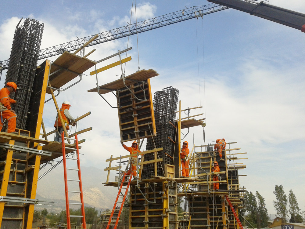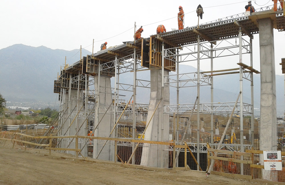 Se realizaron los pilares con sistema ORMA, con una de sus caras inclinadas. Para los muros curvos facetados, obras auxiliares, como camarines, sala de prensa, etc., se utilizó el sistema Nevi.