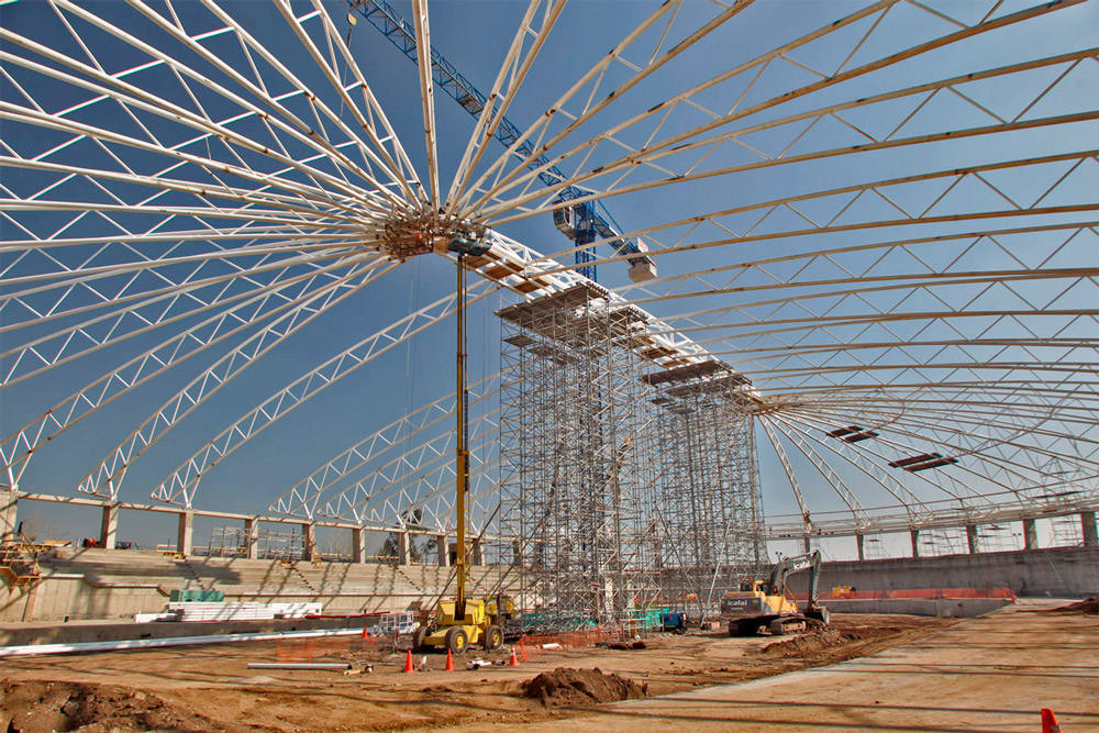 Para solucionar la instalación de este primer velódromo techado, se emplazaron torres de apuntalamiento, o apeo, del sistema T-60 con vigas BTM como plataforma superior. De esta manera se montaron las dos vigas principales de la techumbre y se unieron las estructuras a 22 metros de altura.