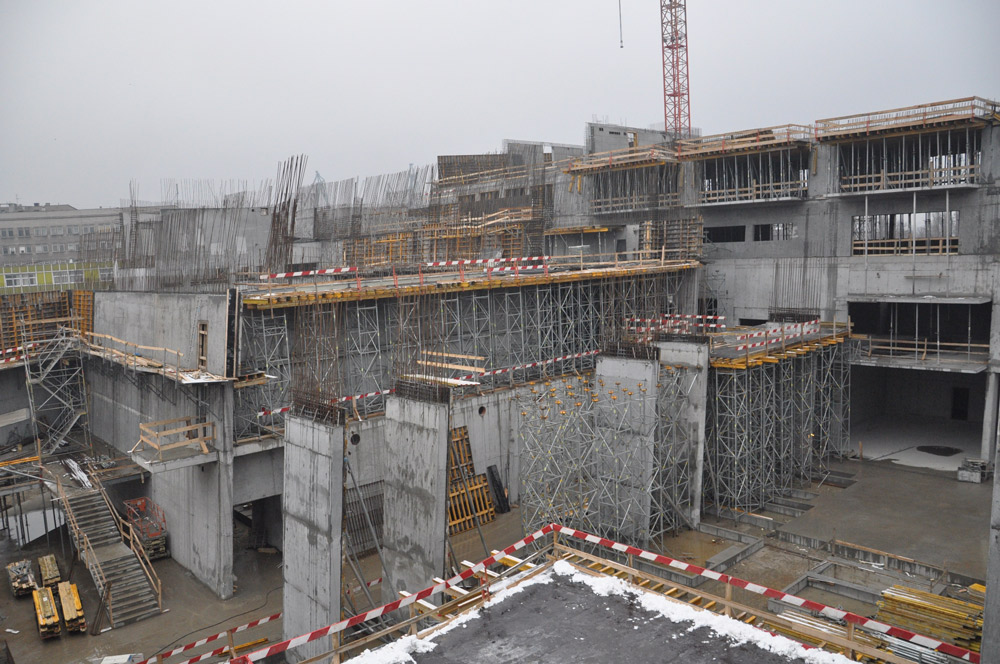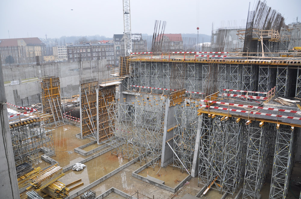 Ante una inclinación de 6,5º y muros exteriores de gran altura, ULMA apostó por una solución única: un moldaje modular vertical, para tongadas de 8 m, y plataformas de trabajo que garantizaban la seguridad laboral.