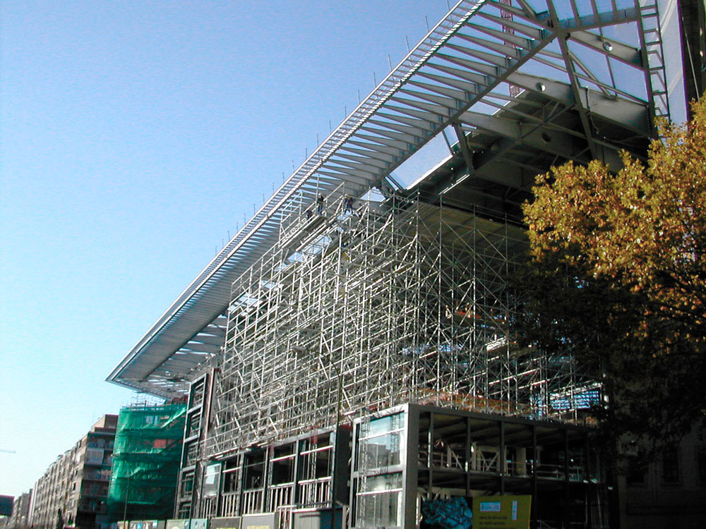 El mayor desafío del proyecto residió en las formas curvas de los muros de hormigón, y otras superficies de intensa inclinación. También fue necesario emplear un medio auxiliar que permitiera realizar la cubierta, que se eleva 6 metros sobre las terrazas de los edificios. Su voladizo, de 36 m de vuelo, representó un reto no sólo técnico sino también de seguridad para los trabajadores.