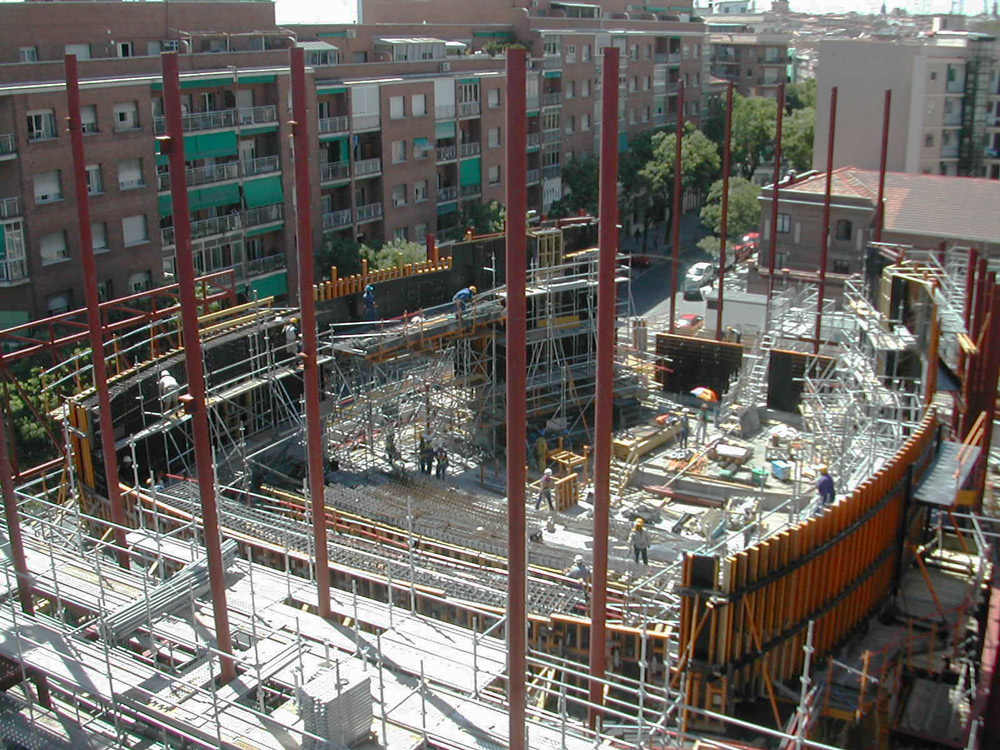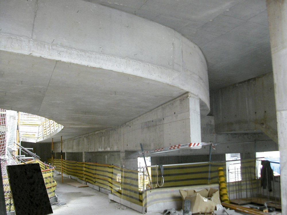 Para solucionar la ejecución de los muros, se aplicó el Moldaje ENKOFORM V-100 en las superficies verticales curvas y en otras inclinadas. Parte de este sistema fue montado in situ, y el resto enviado a obra premontado. Se adaptó a la perfección a las formas diversas de la estructura y a las fuertes presiones de hormigonado.