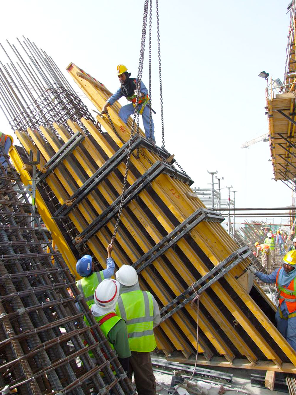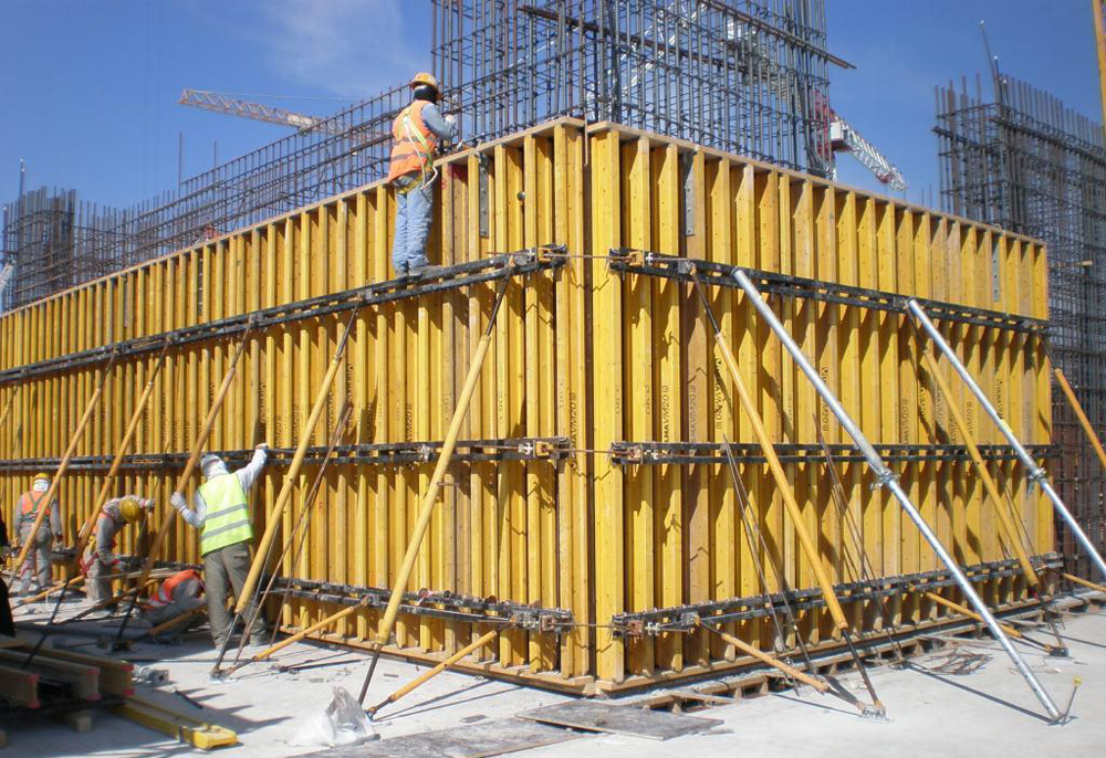 Los muros de apoyo e inclinados, de forma variable, además de las estructuras de núcleo se ejecutaron de manera rentable con el Modular Vertical ENKOFORM V-100. Este sistema solucionó la ejecución de varias estructuras, con diferentes geometrías, consiguiendo altos rendimientos y excelentes acabados. Con sus piezas estándares, riostras metálicas y vigas de madera, se realizaron paneles a medida obteniendo las configuraciones complejas del proyecto.
