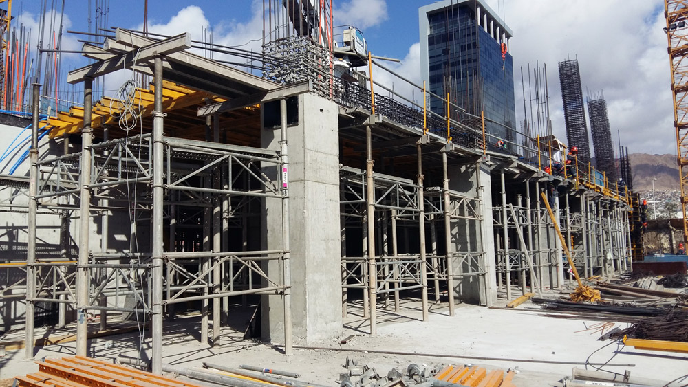 Las losas se desarrollaron con diferentes sistemas según las alturas, utilizando puntales de aluminio ALUPROP sobre 4 m hasta 12 m de altura, y puntales SP para alturas normales.