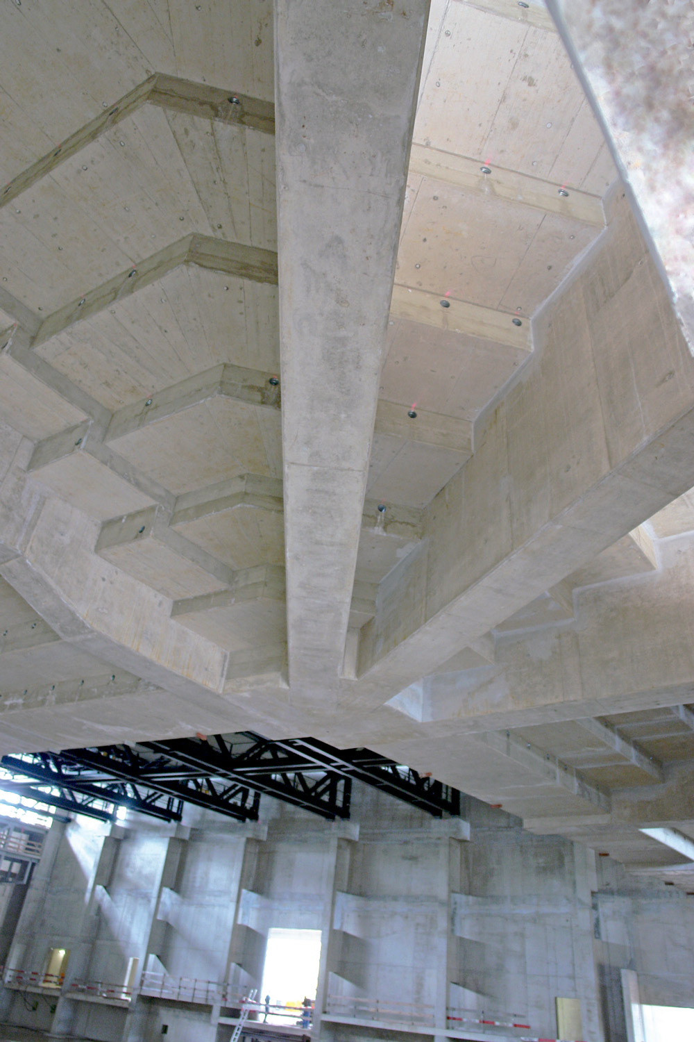 Un edificio de estas magnitudes necesitó del producto más adecuado para cada solución: Moldaje ORMA para la ejecución de muros, Mesas VR para la losa y estructuras de T-60 como sistema de transmisión de cargas. Estos sistemas proporcionaron, en todo momento, el acabado de hormigón visto requerido en obra y su adaptación a las diferentes geometrías.