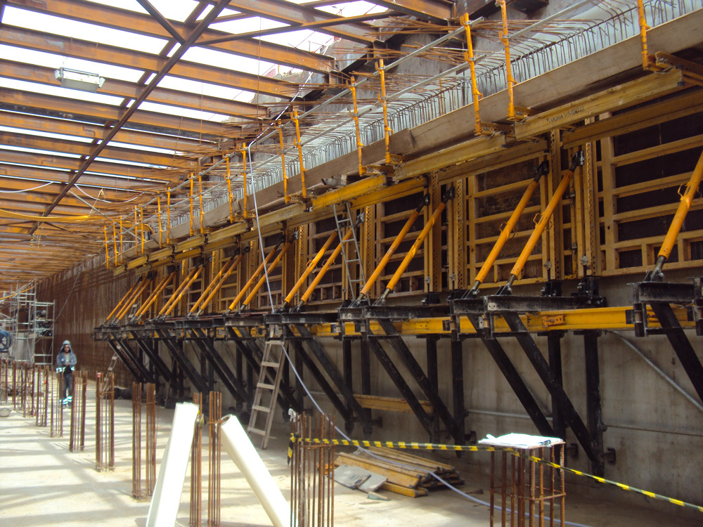 Los muros laterales a una cara de 5,7 m se han realizado con Moldaje Modular ORMA y cerchas que se han trasladado con carros de una puesta a otra sin la necesidad de ser desmontadas. Por razones de ejecución, se han llevado a cabo en dos fases, la primera con cerchas SMK y la segunda con consolas de trepado a una cara SBF.