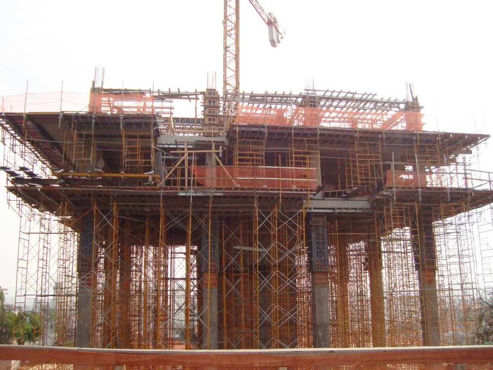 En alturas bajas, las estructuras horizontales se apearon con Puntales SP. En zona perimetral y alturas superiores a la de puntal, se utilizó Cimbra G. La geometría cambiante del edificio exigió el cubrimiento de voladizos con vigas y perfiles metálicos en posiciones variables en cada piso.