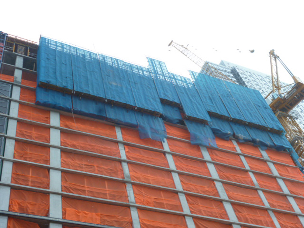 Para garantizar un espacio de trabajo seguro, se ha cubierto el perímetro del edificio con la protección autotrepante HWS. Son paneles que envuelven la planta en ejecución y tres plantas inferiores y que se elevan de manera hidráulica, a medida que se crece en altura.