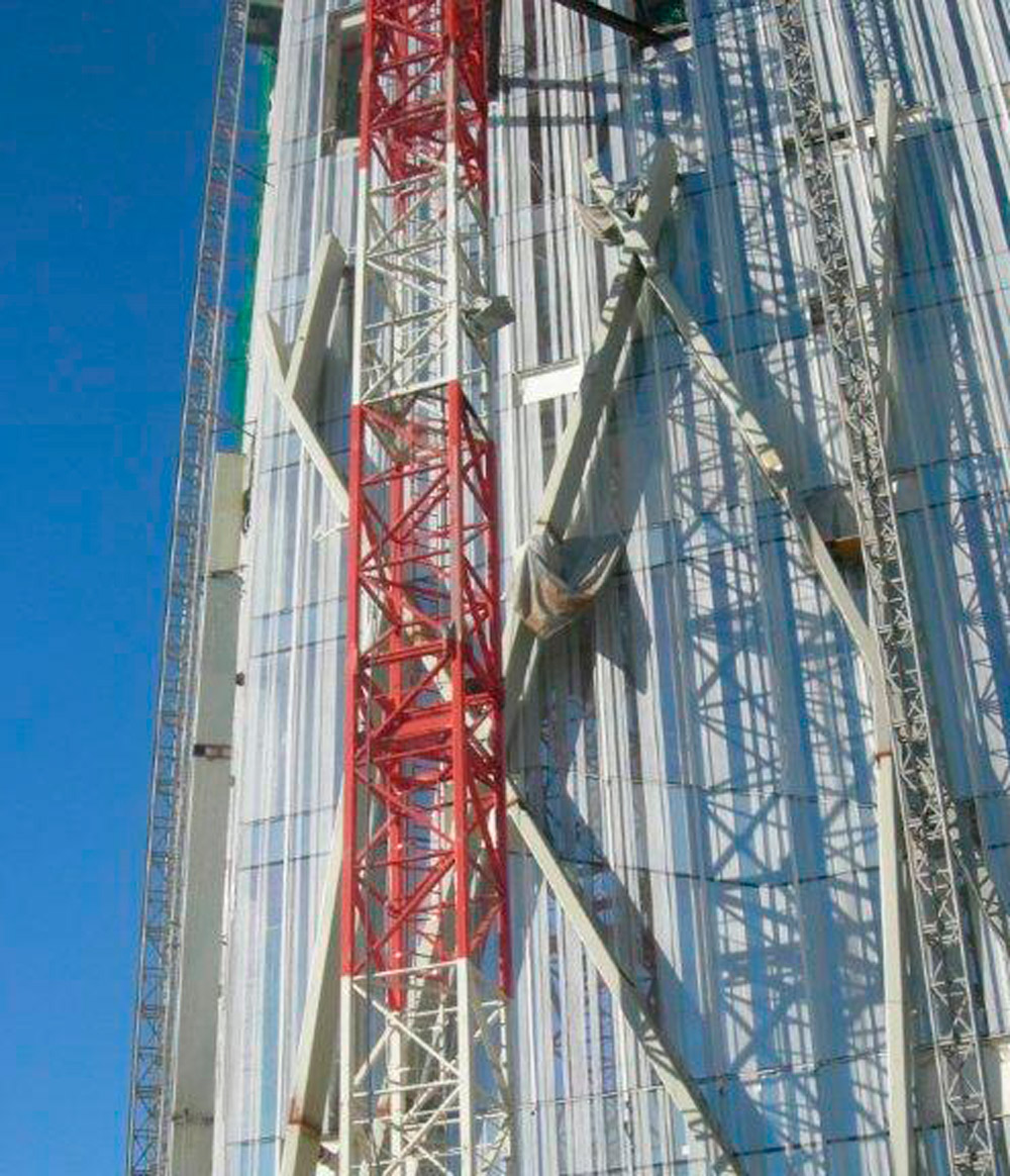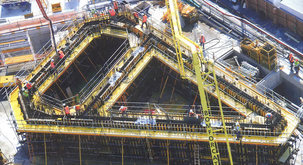 El núcleo central se ha ejecutado dos plantas por delante de los forjados, mediante trepado con Consola 2000 y ENKOFORM V-100. Gran parte de las losas se construyeron con el moldaje horizontal RAPID y, en algún caso, con ENKOFLEX.