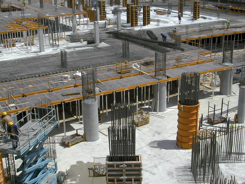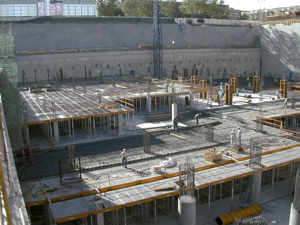 Las 6 plantas subterráneas y las 6 primeras desde rasante, se realizaron con el moldaje horizontal de aluminio CC-4, junto con el ALUPROP, con el que se consiguió grandes rendimientos en obra. Una de las ventajas más importantes que aporta CC-4, frente a otros productos del mercado, es la posibilidad de montar primero la retícula y después colocar los paneles.