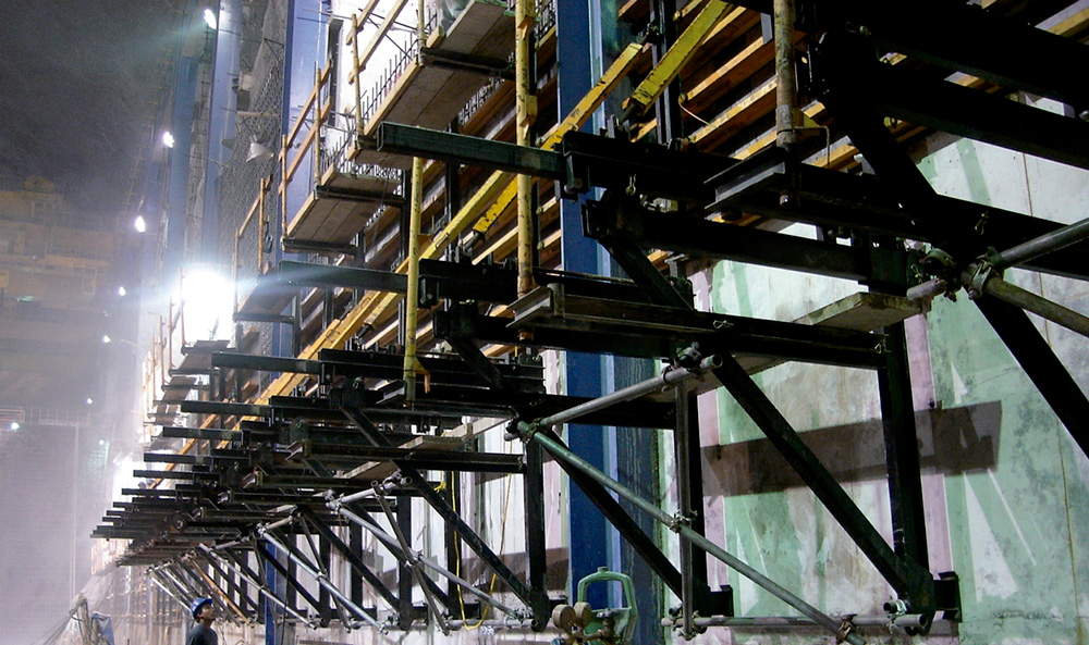 La perfecta combinación entre los sistemas trepantes con retranqueo y el moldaje Vertical ENKOFORM V-100 solucionaron la realización de los muros, la galería de drenaje y el recinto generador de la sala de máquinas.