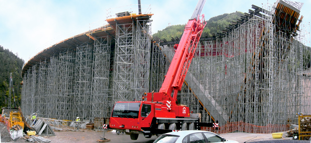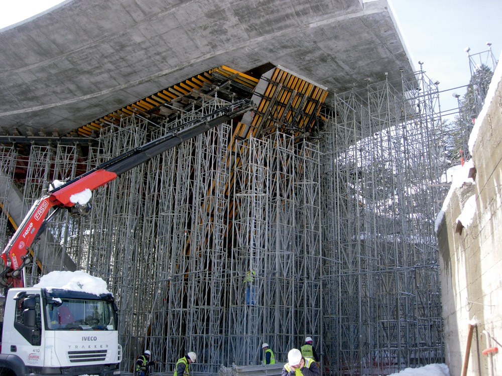 En la ejecución de los tableros, de más de 250 metros, se empleó la solución más eficaz constituida por el sistema de Moldaje ENKOFORM HMK apeado con cimbra. En aquellos casos en los que fue necesario cubrir pasos de 28 m de luz, se emplearon Estructuras H-33 combinadas con torres modulares de T-500. Para adaptarse a las distintas secciones de tablero se utilizaron dos riostras, con la forma de la sección del puente, apoyadas sobre los cabezales de la cimbra. Las riostras soportaron a su vez las vigas que determinaban las medidas de cada paño. Con este sistema de unión se asegura la estabilidad del conjunto en la fase de trabajo y durante el cambio de moldaje. Estos paños se desencofraron mediante trácteles colocados sobre el tablero, así fue posible trasladarlo a la siguiente posición, sin ser desmontado. La mano de obra necesaria para su montaje y desmontaje es menor que con otros sistemas, sobre todo cuando se producen varias puestas, como en este caso, con varios puentes iguales o viaductos de gran longitud.