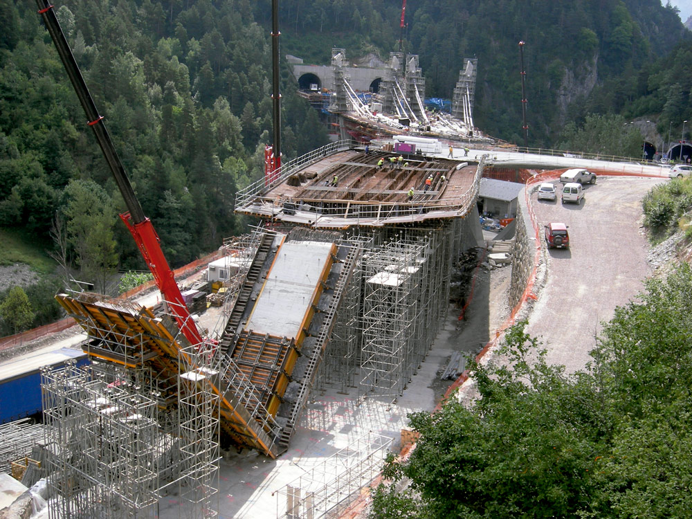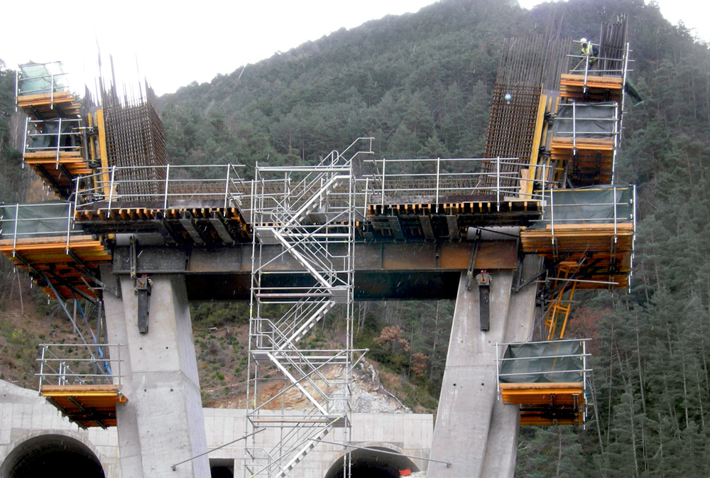 La pila ejecutada, en el nudo de las tres estructuras, se planteó como un trípode sobre un plinto. Las palas de distintas longitudes, de 3,5 m de anchura y una sección variable, se realizaron con los mismos productos que en el tablero del viaducto, rentabilizando así las distintas fases de obra. Los paños, de aproximadamente 4 m, se constituyeron con moldaje de fondo (ENKOFORM HMK), dos laterales y uno de tapa, permitiendo así el desmontaje por partes y un perfecto acabado de hormigón visto. El soporte se estableció con cuatro vigas de apoyo DU-120 sobre una serie de torres de cimbra. Estos soportes ligeros, de fácil montaje y manipulado, se transportaron con grúa ya que disponen de ensamblajes de bloqueo automático. Así estas torres premontadas agilizaron la labor de los operarios y ahorraron costes y tiempos de trabajo.
