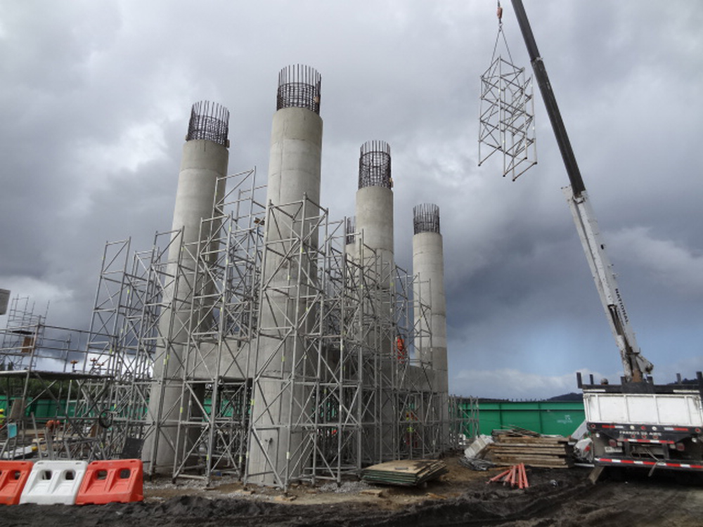 Para este proyecto, se resolvió realizar cimbras para las cepas en dos etapas, debido a la existencia de una viga de amarre en el centro de la cepa, esta viga intermedia está en alturas variables, desde los 2 metros a 4 ó 6 metros (imagen 0088), luego se debía continuar con las torres T-60 en altura para poder alcanzar el fondo de la cepa, a alturas variables de 7 a 12 metros (imagen 0111).