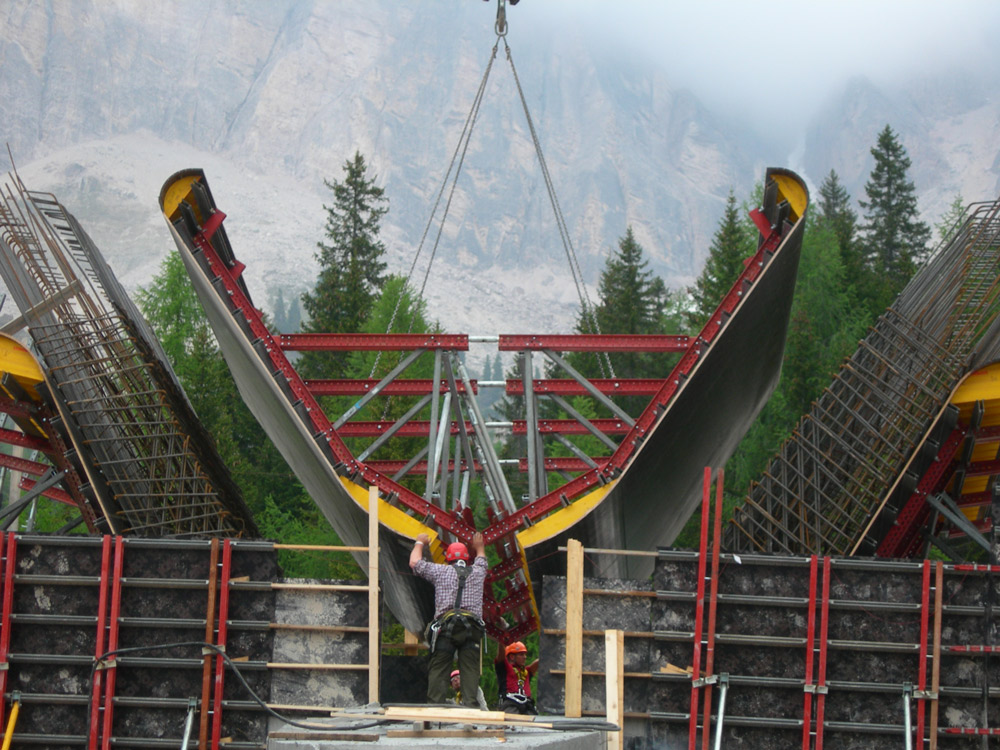 La curvatura específica y la geometría inclinada se resolvieron mediante husillos amoldables a cualquier dirección sobre las cimbras. Ello garantizó unos ajustes perfectos sin utilizar plantillas de madera, lo que supuso un gran ahorro en costes.