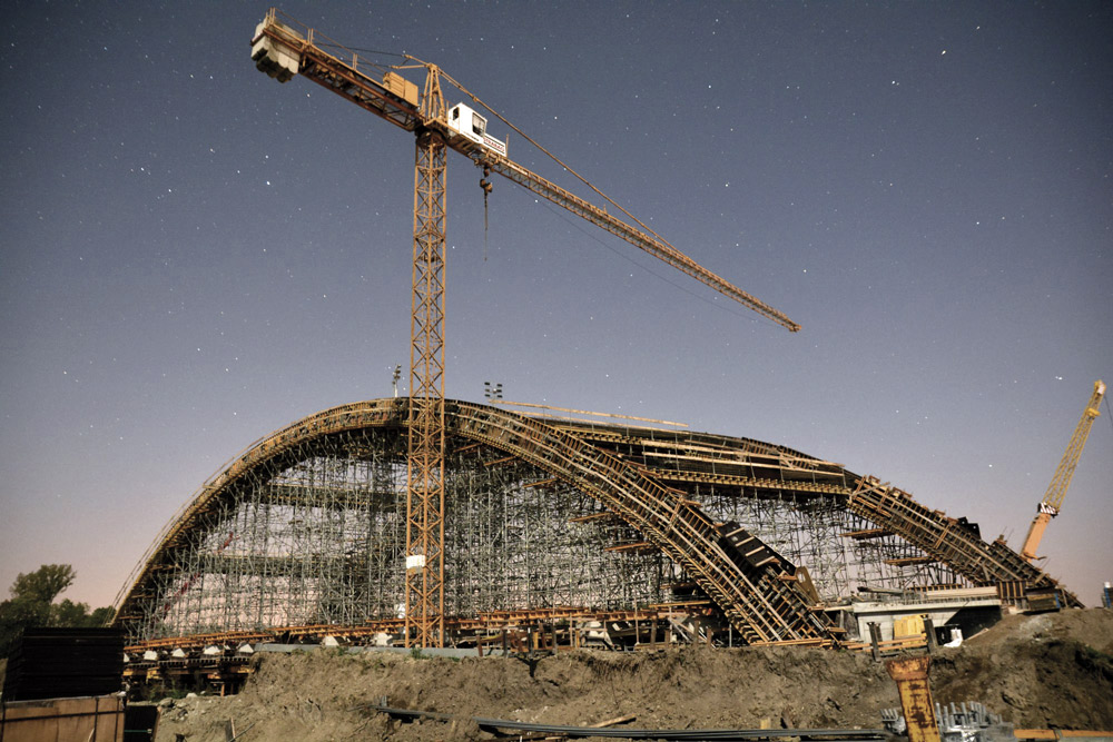 Los arcos y vigas transversales también se han construido con el moldaje ENKOFORM VMK, ya que ofrece gran resistencia y versatilidad. La curvatura del tablero fenólico, se ha logrado mediante camones. Y para dar forma al arco, se han utilizado los tensores E sobre riostras y conectores MK en la parte más pronunciada. La curva de la parte central del arco, menos acentuada, se ha obtenido por la simple regulación de los husillos del sistema de apeo.