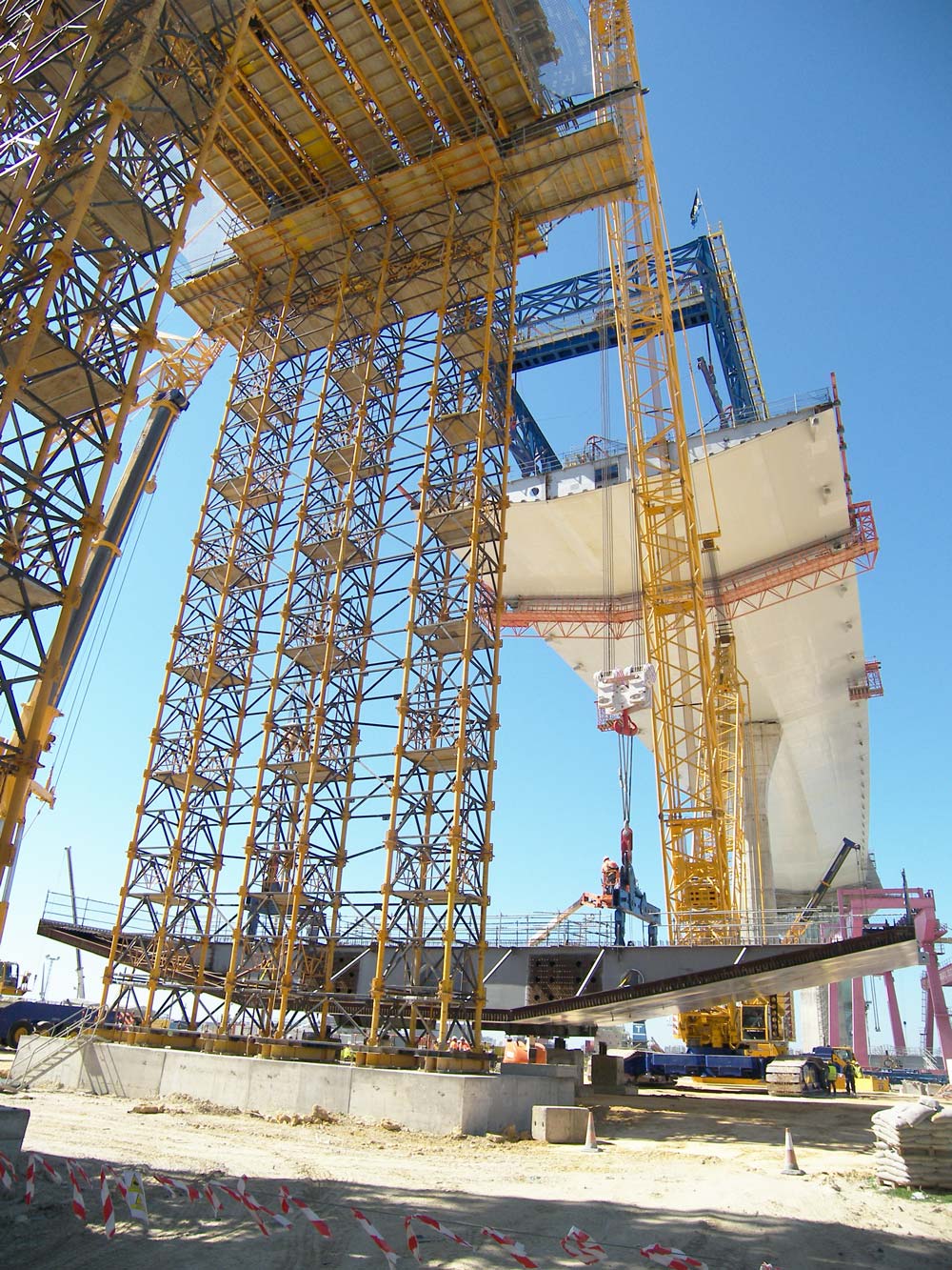 El primer tramo de 380 m, próximo al estribo, consta de 9 pilas con vanos de 40 m. La ejecución se ha llevado a cabo en 10 fases, cada una de aproximadamente 40 m. La fase tipo comprendía las ¾ partes de un vano, más ¼ del siguiente que quedaba de esta forma en voladizo. Con una sección constante del tablero de 2 m, el hormigonado se ha realizado de una sola vez. Para este tramo, se ha planteado un sistema de cimbra cuajada que ofrece todas las garantías de robustez, seguridad y flexibilidad en combinación con moldaje de puentes ENKOFORM HMK.