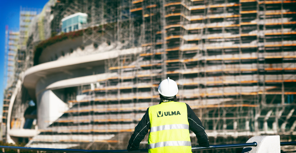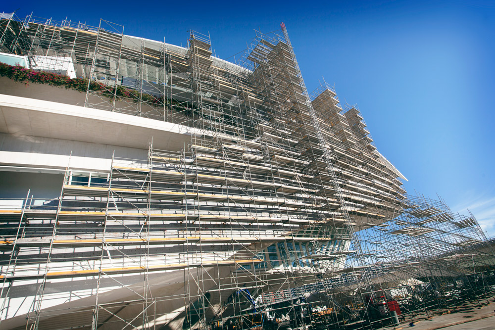 Para abarcar la forma curva del edificio, se han empleado 48.000 m3 de volumen de andamio y 12.000 m2 de andamio de fachada mediante vuelos consecutivos. Se han generado plataformas de trabajo de 700, 1.020, 1.500 y 2.000 mm de anchura. De esta manera, se ha garantizado en todo momento la seguridad de los trabajadores y se ha manteniendo en todo lugar una distancia mínima entre el andamio y la fachada. El acceso a los lugares de trabajo se ha realizado por las escaleras que el andamio lleva incorporadas.
