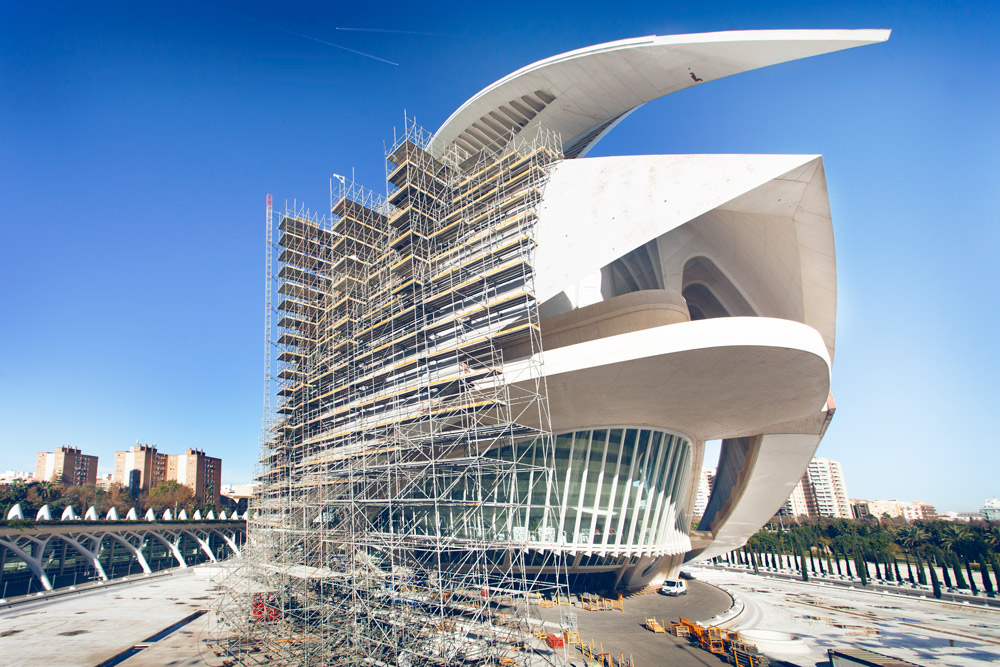 Para abarcar la forma curva del edificio del Palacio de las Artes, se han empleado 48.000 m³ de volumen de andamio y 12.000 m² de andamio de fachada mediante vuelos consecutivos.