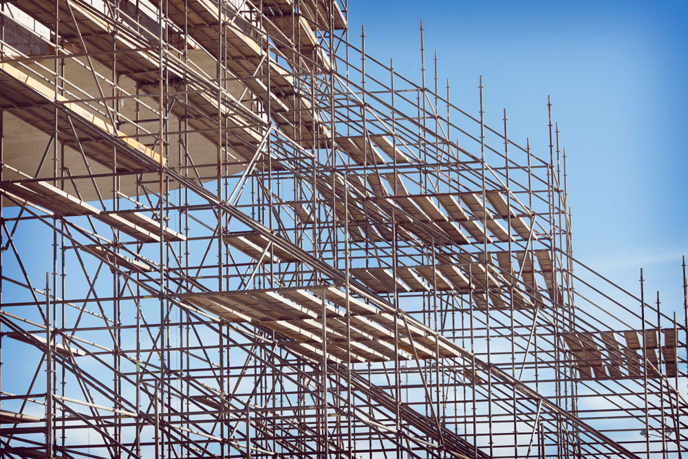 Buscando la estabilidad de los andamios empleados, se han amarrado mediante anclajes a la estructura metálica del edificio y ampliado su base hasta 12 m en algunos puntos para garantizar su firmeza. También se han adosado montacargas al andamio para el traslado de los materiales de la cubierta.