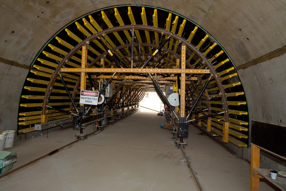 Su sistema hidráulico permitió un suave desmoldaje, y sus motores de accionamiento eléctrico trasladaron los carros a una velocidad de 6,2 m/minuto. El diámetro interno de los túneles fue de 6,5 m, con espesores de muro variable de entre 37,5 cm (parte más alta) y 70 cm en la parte baja de los hastiales.