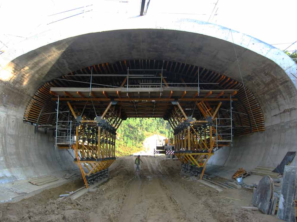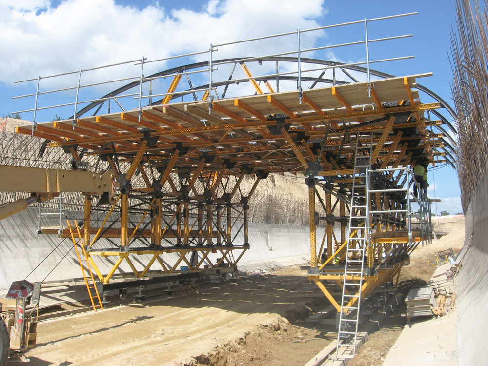 Para realizar la bóveda del falso túnel, el moldaje interior se sitúa sobre un carro porta-moldaje, desplazable por raíles. El carro es una estructura de Riostras MK, con plataformas de trabajo a varios niveles con barandillas de 1,5 m y accesos seguros.