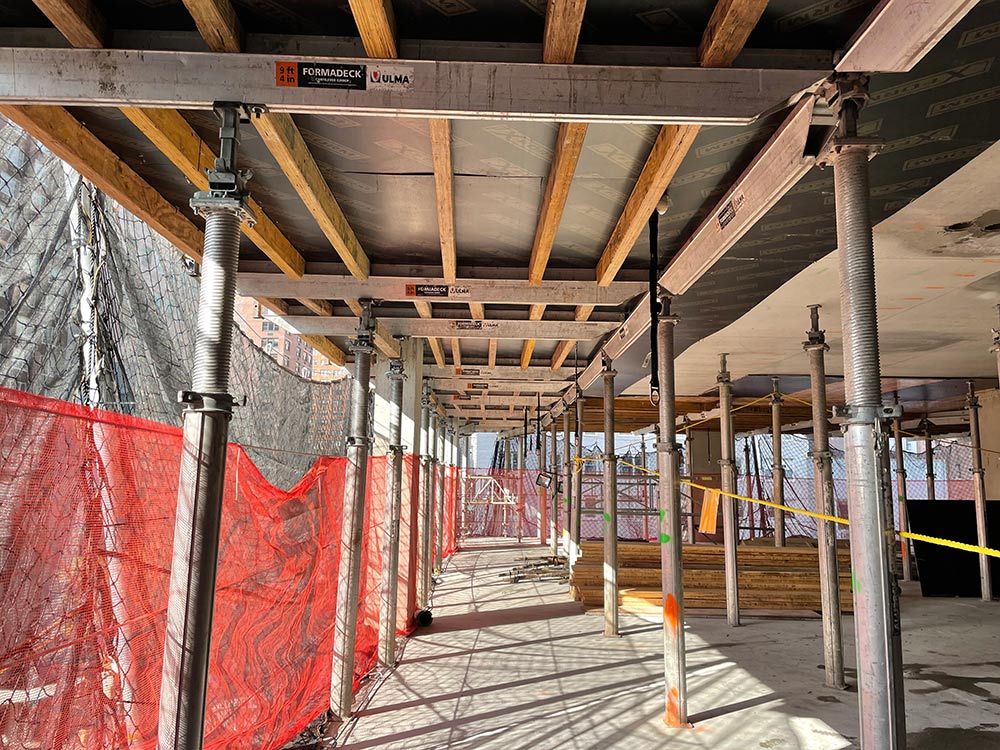 FORMADECK proporciona un método rápido y eficaz para encofrar grandes superficies, y ENKOFLEX ofrece versatilidad. Con estos dos sistemas es posible solucionar de forma segura y eficiente casi cualquier situación. En este caso el apeo mínimo era de 2,9 m y el máximo 4,9 m.