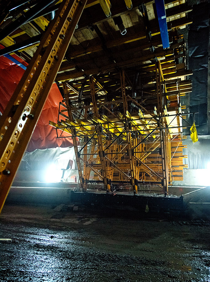 En este proyecto, ULMA ha participado con el suministro de equipos de ingeniería, asistencia técnica y servicio de montaje. En este caso, por las características de la obra y los trabajos simultáneos que tenían lugar en el túnel, el montaje del carro en su totalidad se ha realizado por módulos y en el interior de las galerías. La flexibilidad del sistema MK ha permitido adecuar el proceso de montaje a las dimensiones del paso de evacuación que limitaban el traslado del material ya premontado en el exterior.
