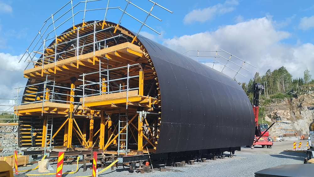 Los falsos túneles tienen una longitud de 80-90 metros y el hormigonado se ha llevado a cabo en secciones de 11 metros de longitud, con ciertos tramos de sección transversal variable. El equipo de ingeniería de ULMA ha diseñado un carro MK de 10 m de ancho y 12 m de longitud. Para ello, el cliente ha requerido de un sistema flexible, rentable y modular que le permita realizar ajustes en caso necesario y trasladarlo a la siguiente fase con facilidad. De hecho, la presencia de rieles ha simplificado el proceso de mondaje, desencofrado y la elevación y descenso de los segmentos, así como el desplazamiento longitudinal del carro que se ha realizado en 7 días.