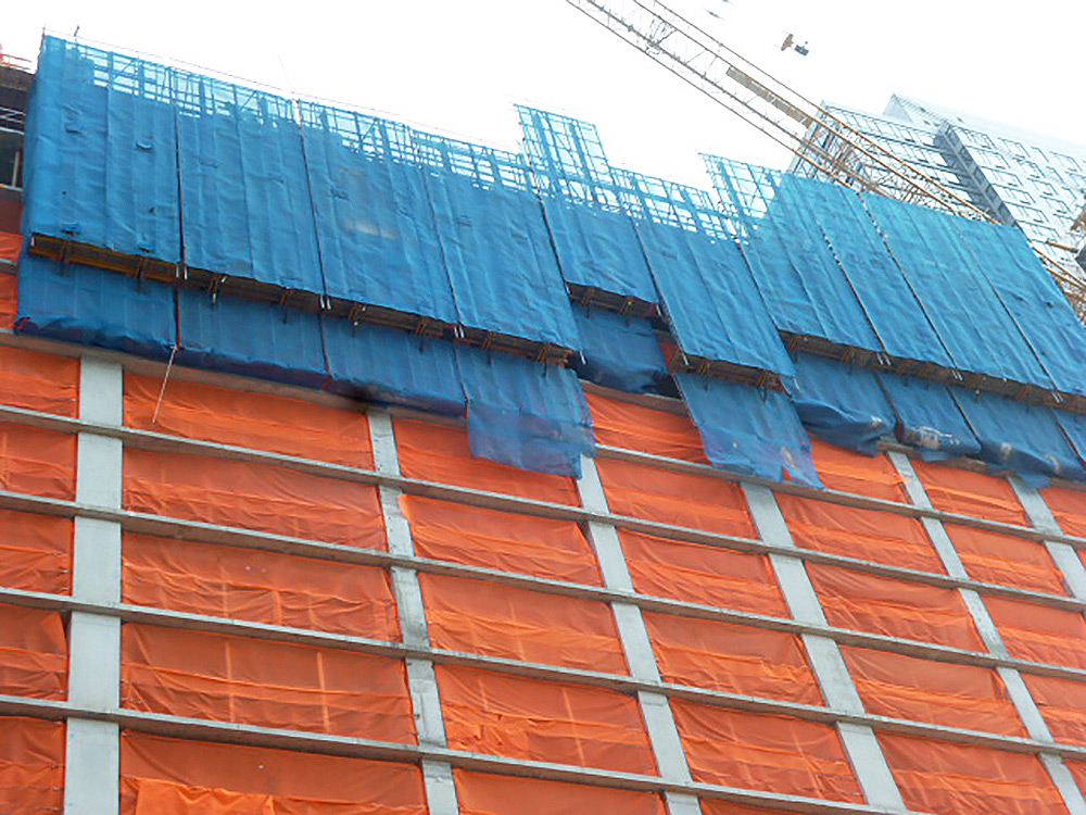 Para garantizar un espacio de trabajo seguro, se ha cubierto el perímetro del edificio con la protección autotrepante HWS. Son paneles que envuelven la planta en ejecución y tres plantas inferiores y que se elevan de manera hidráulica, a medida que se crece en altura.
