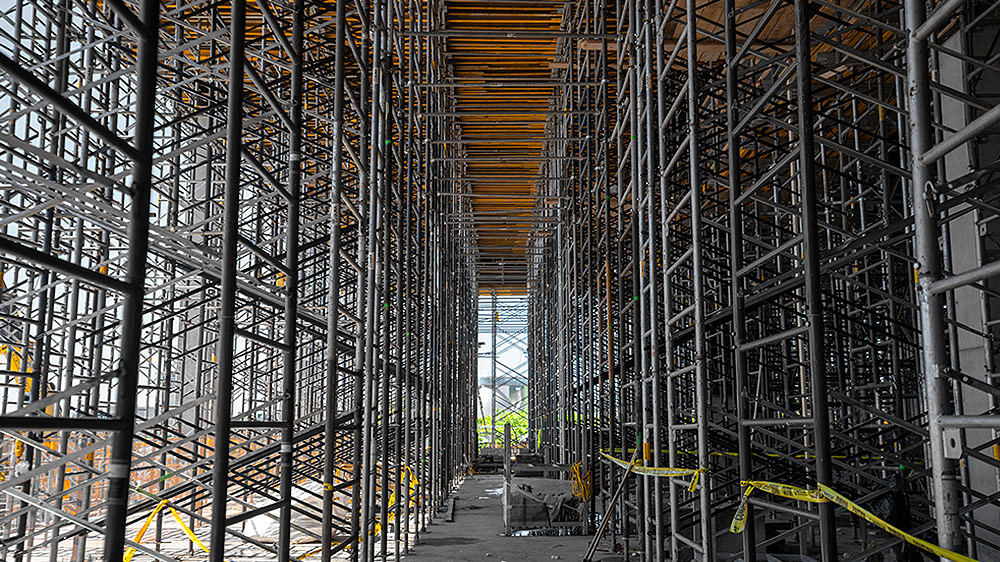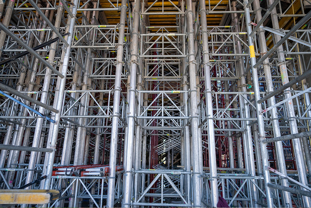 La cimbra MEGAFRAME y las torres ALUPROP destinadas al apeo de las losas a gran altura, se han configurado con marcos de arriostramiento para asegurar la alineación, la estabilidad y la correcta distribución de cargas en toda la estructura. Como moldaje de losa se ha empleado el sistema ENKOFLEX, una solución flexible e ideal en geometrías variables. La combinación de ambos sistemas ha permitido cubrir las alturas requeridas con seguridad y eficiencia.