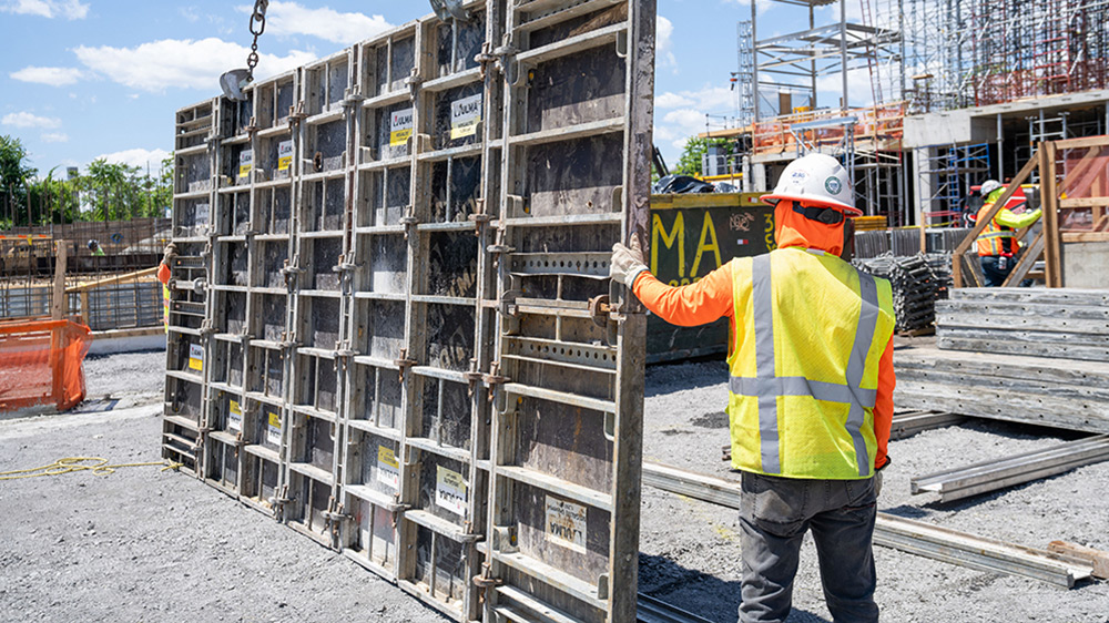 Para los muros del núcleo y las columnas, se ha utilizado el moldaje modular MEGALITE, una opción ligera y resistente que facilita el trabajo en elementos verticales y zonas de transición.