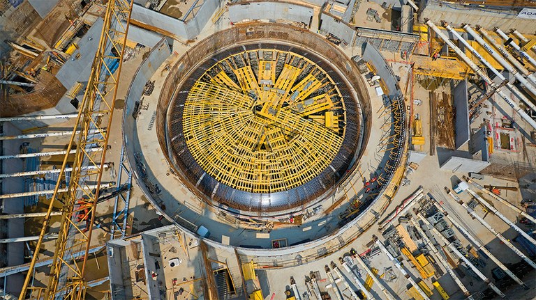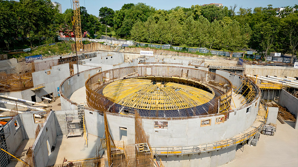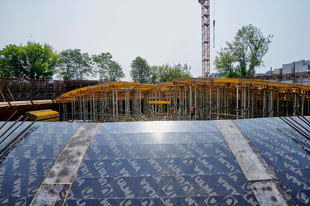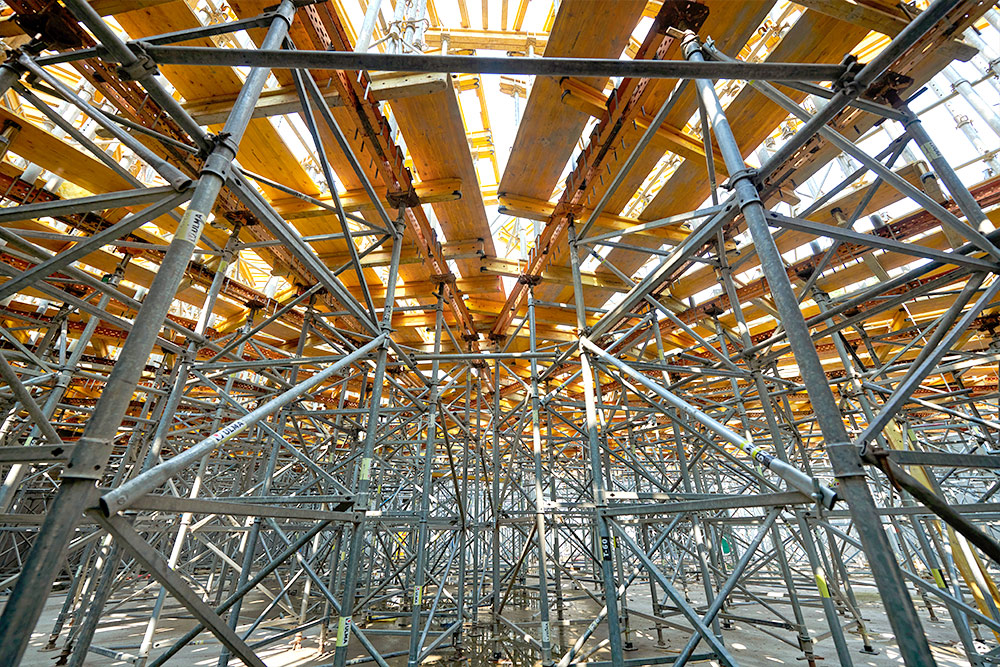 La complejidad de su geometría ha requerido un sistema de moldaje de alta precisión. ULMA ha desarrollado una solución basada en el Sistema MK y vigas VM‑20, con componentes personalizados y premontados para definir con exactitud los nervios portantes de la cúpula. El apeo se ha resuelto con torres de cimbra T‑60 y puntales, mientras que el moldaje para los nervios de hormigón se ha diseñado con el sistema de vigas ENKOFORM. La ejecución se ha planificado en varias fases, coordinando diseño, montaje y suministro de equipos.