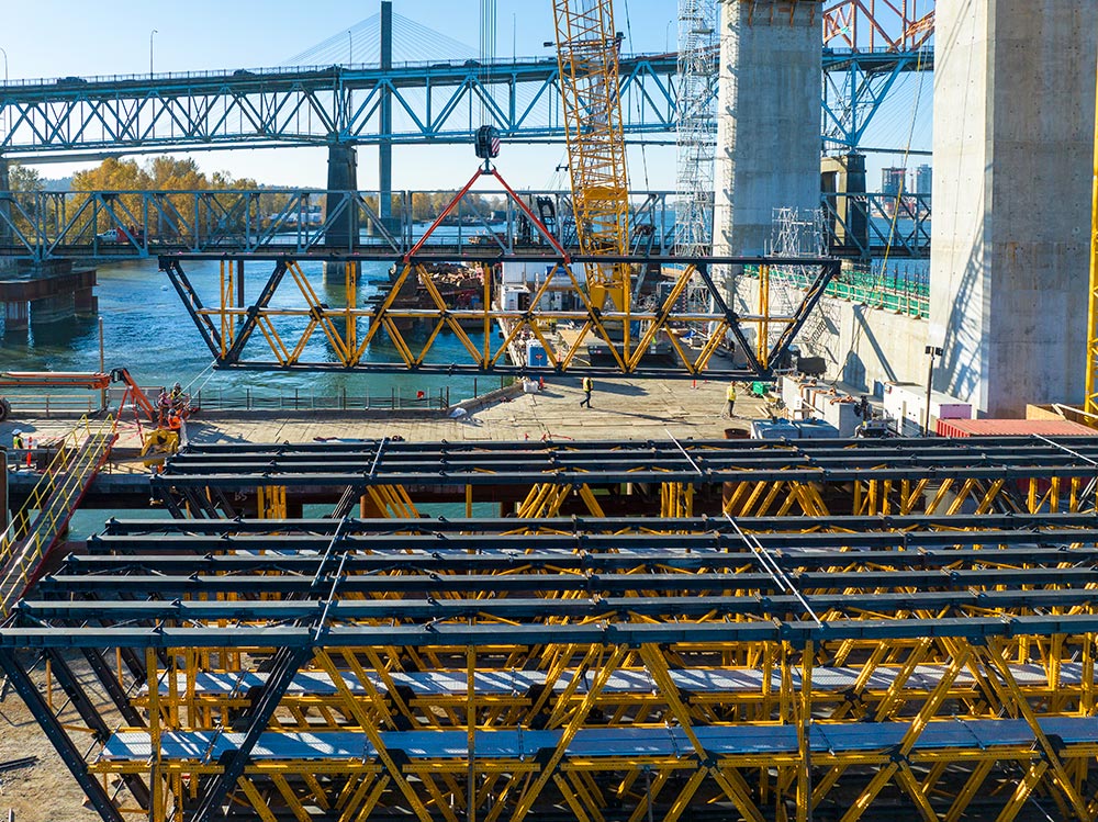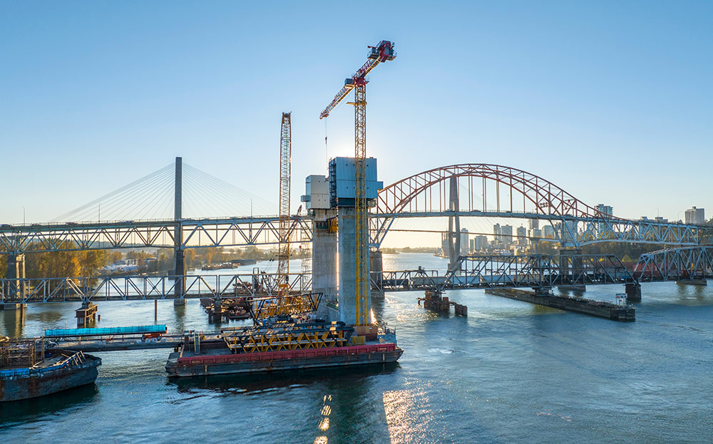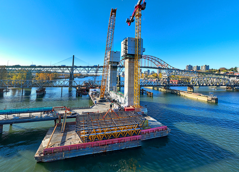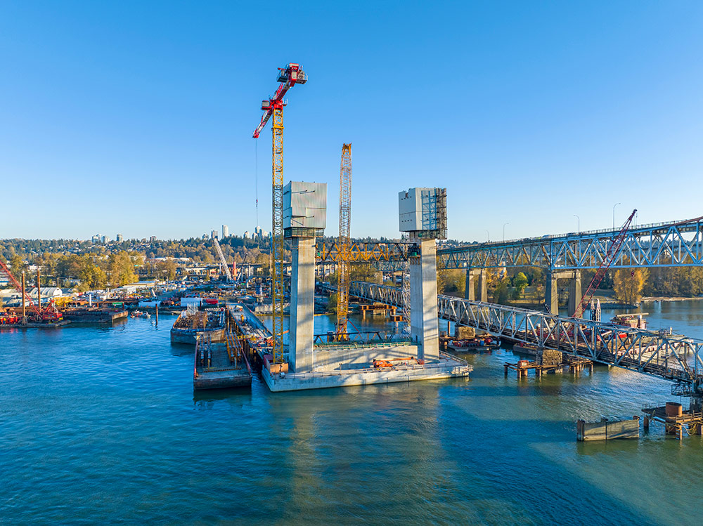 - Dos vigas transversales de hormigón in situ conectan los pilonos del puente Pattullo en las cotas +39 m y +107 m.