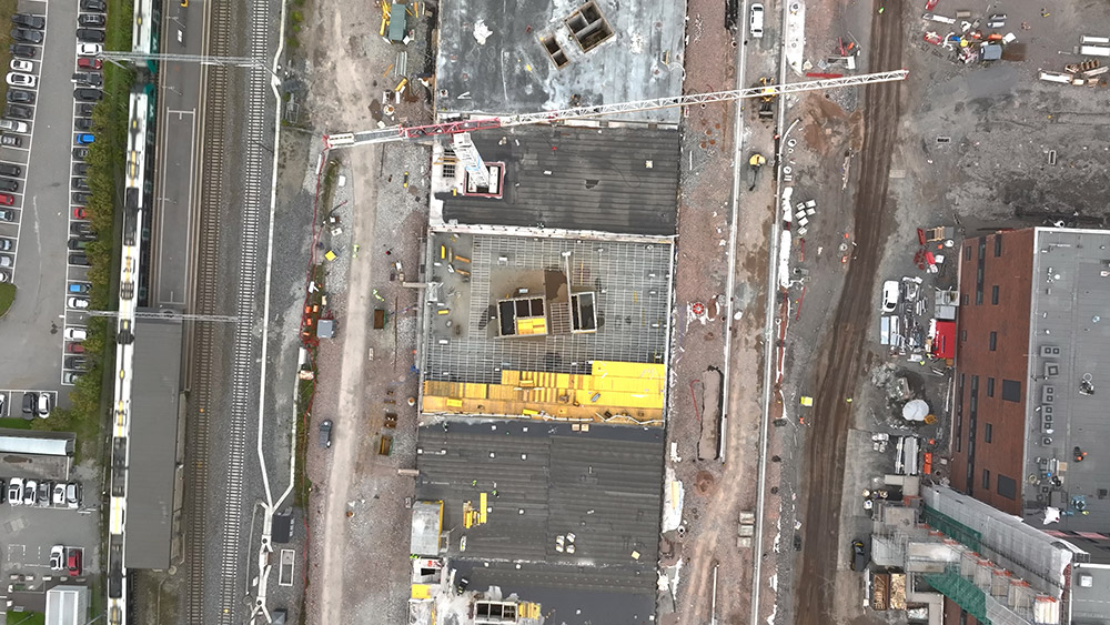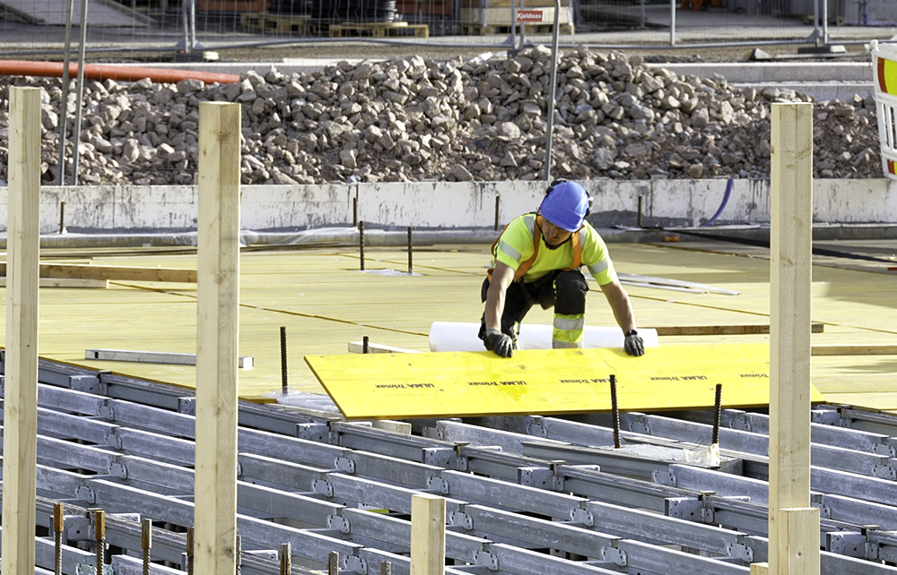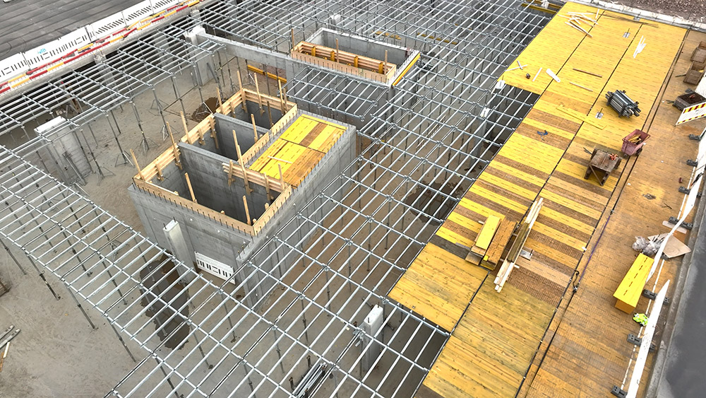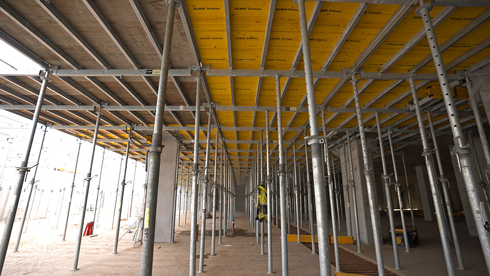 Para la ejecución de la losa postensada, de 35 cm de espesor, se ha optado por dividir los trabajos en fases de aproximadamente 1.000 m². En estas superficies, ULMA ha suministrado Moldaje recuperable ONADEK, en combinación con puntales EP y vigas de madera para los remates. La elección de ONADEK ha permitido abordar con eficacia los requisitos de geometría, flexibilidad y carga propios de este tipo de losas. Su diseño modular, unido a su facilidad de montaje y desencofrado, ha contribuido a mantener un alto rendimiento en obra.