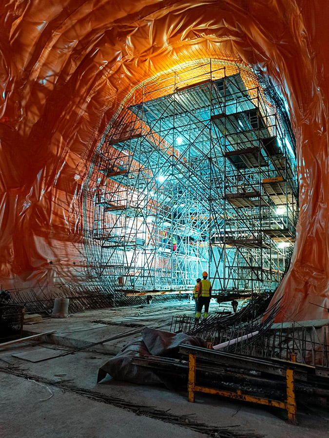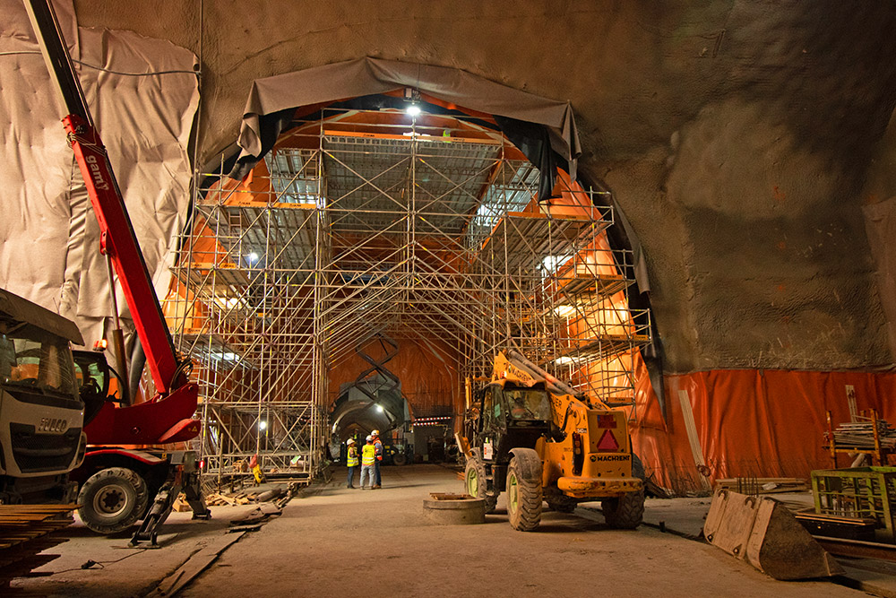 El reto principal en la construcción urbana es la optimización del espacio. En esta obra, la limitación de áreas de almacenaje en el centro de la ciudad se ha solventado con la reutilización inteligente de materiales y soluciones en el interior. La coordinación fue clave: seis carros de moldaje y andamio operaron simultáneamente en el túnel. Esta estrategia maximizó la eficiencia en un entorno de espacio limitado.